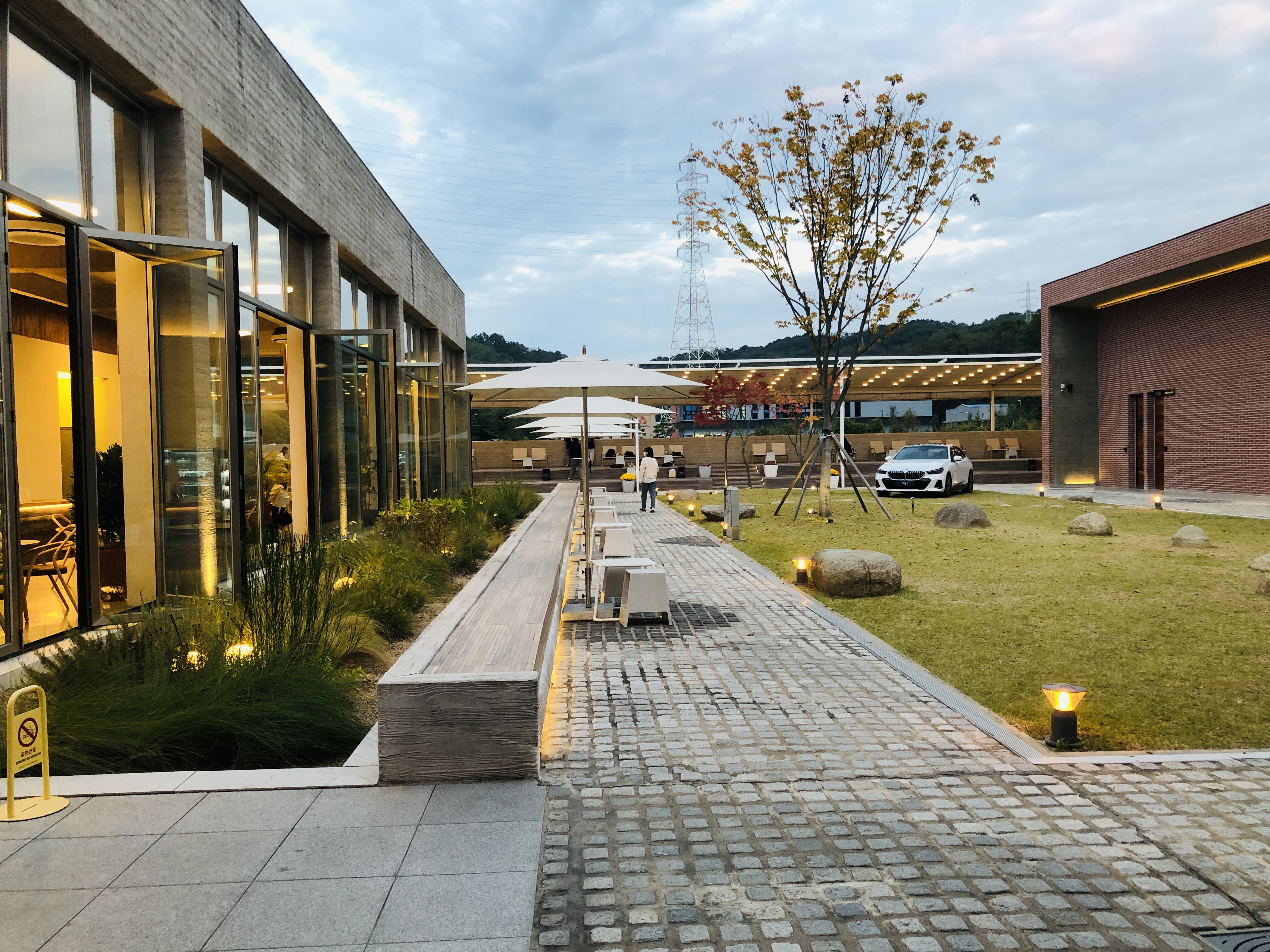 진주 로스팅웨어는 오롯이 중정과 내부 조경을 전망하도록 하고 있다. 그리고 내부 중정은 순환이 되는 동선으로 건물과 외부공간을 이어주고 있다. 100평(300㎡) 정도 되는 실내매장의 크기만큼 야외매장을 확보하고 있어 대형카페의 느낌이 물씬 든다.