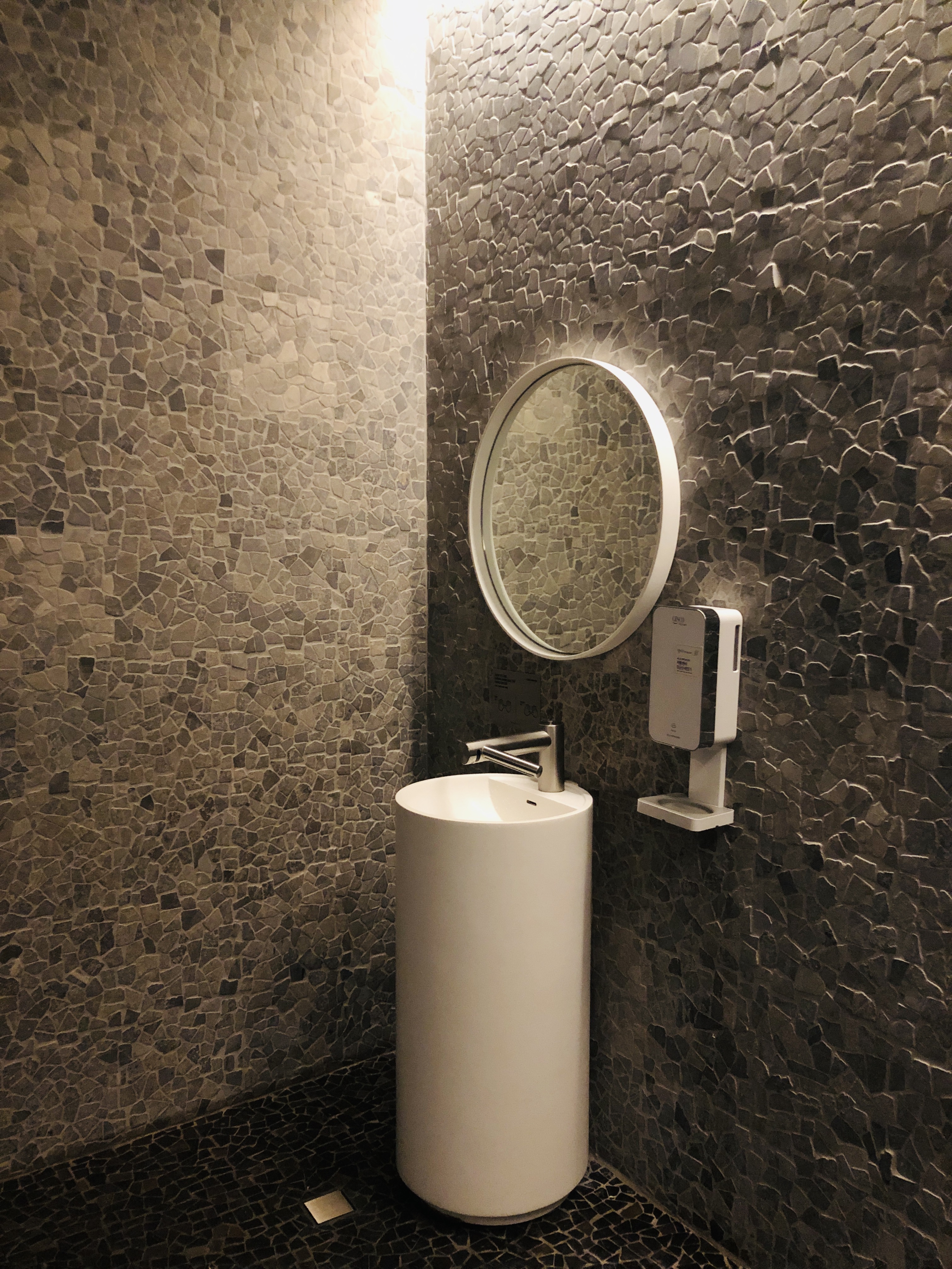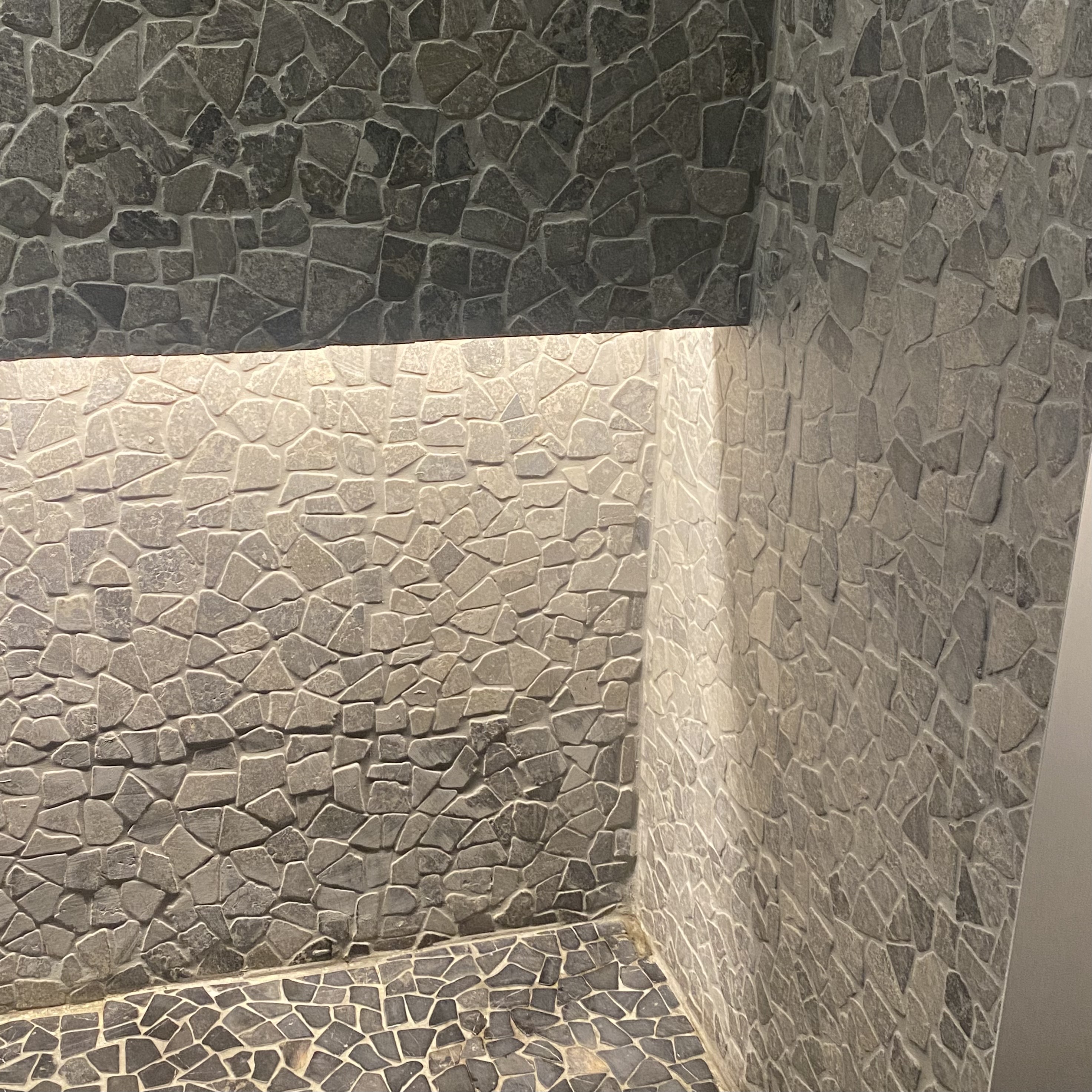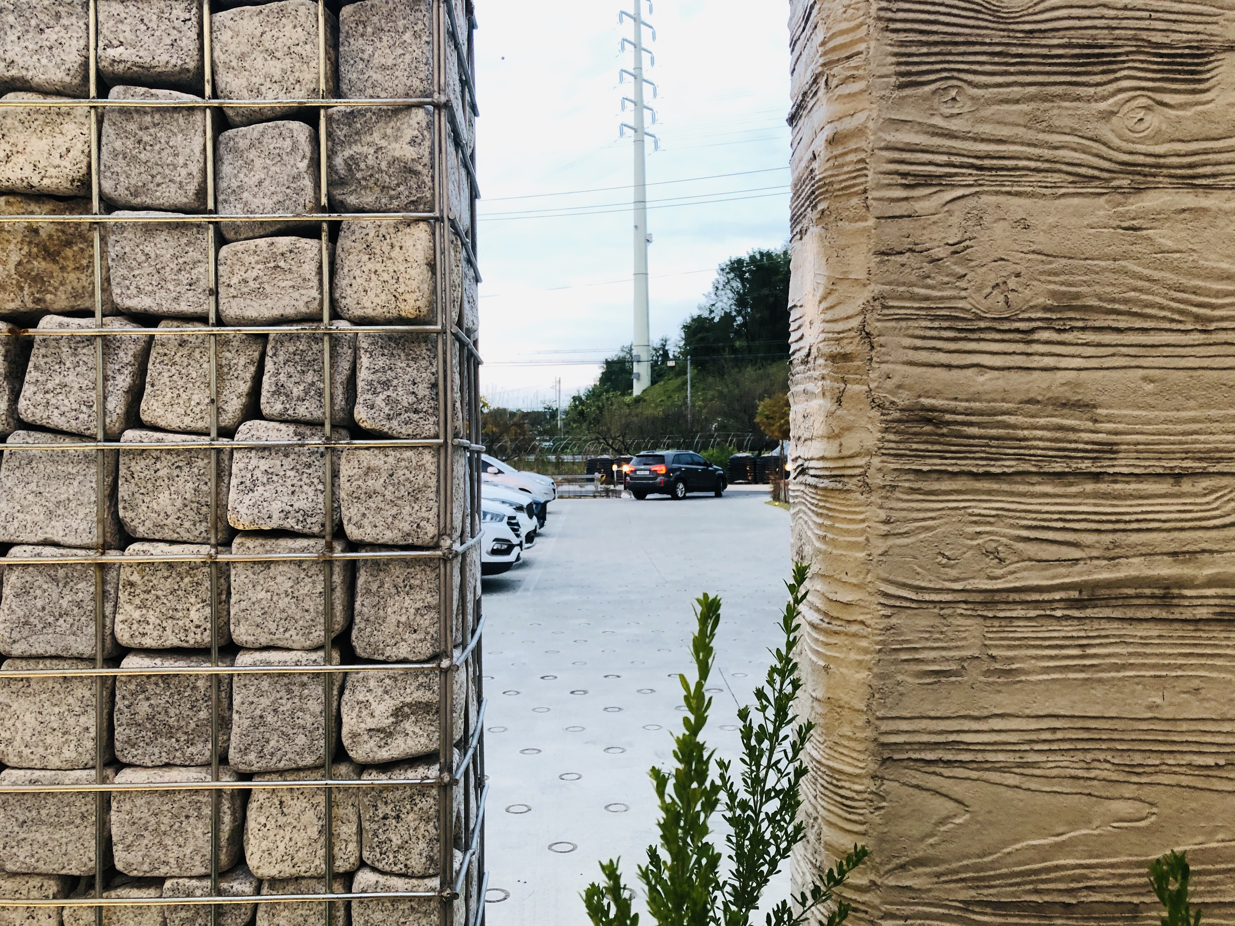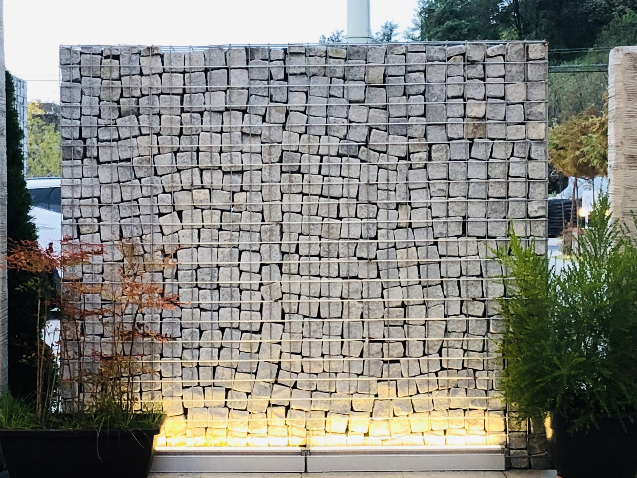 그외에도 사용한 재료로는 사고석을 채워 넣은 개비온과 조명, 플랜트들이 자연적인 느낌으로 조화를 이루고 있다.