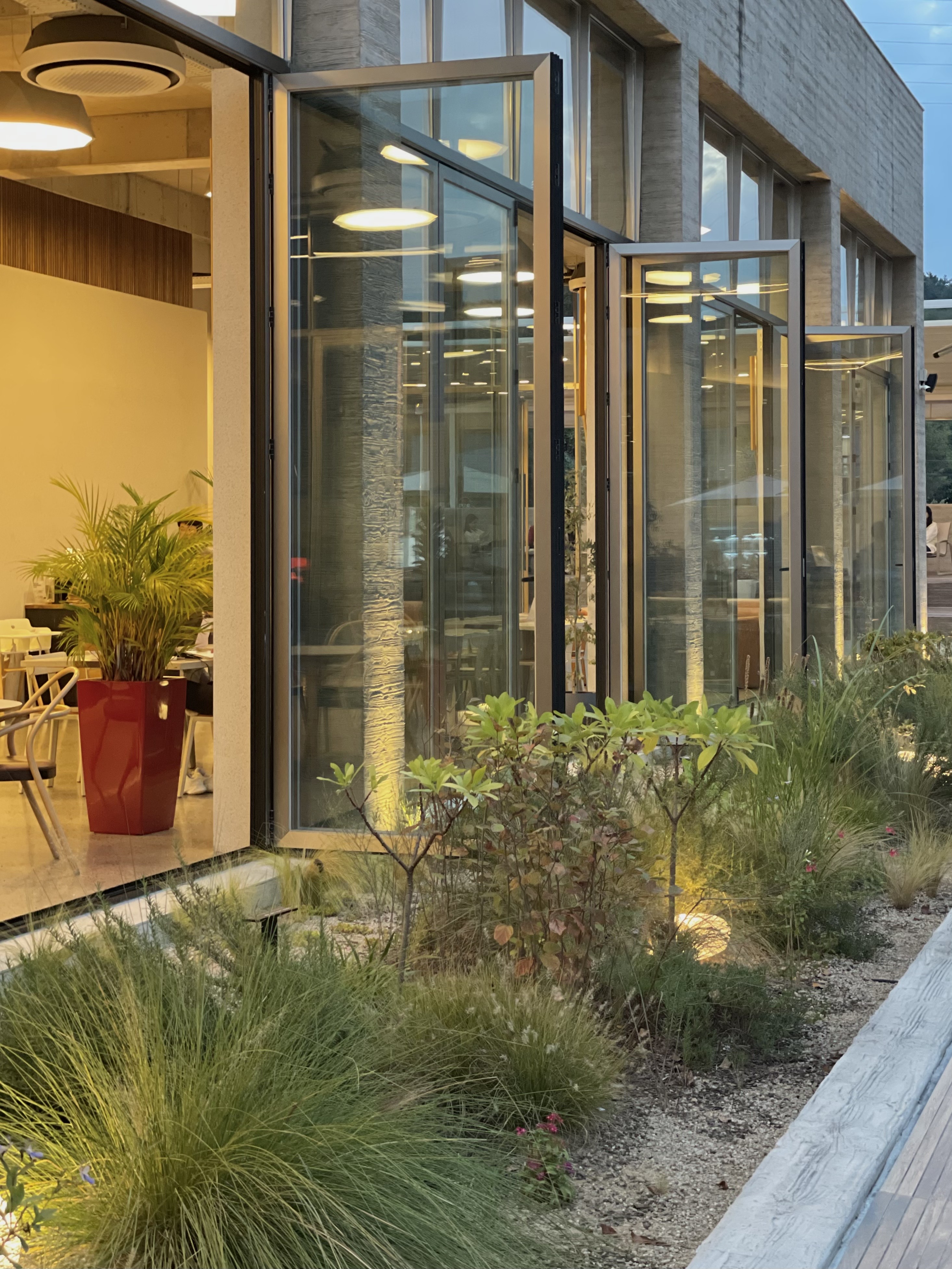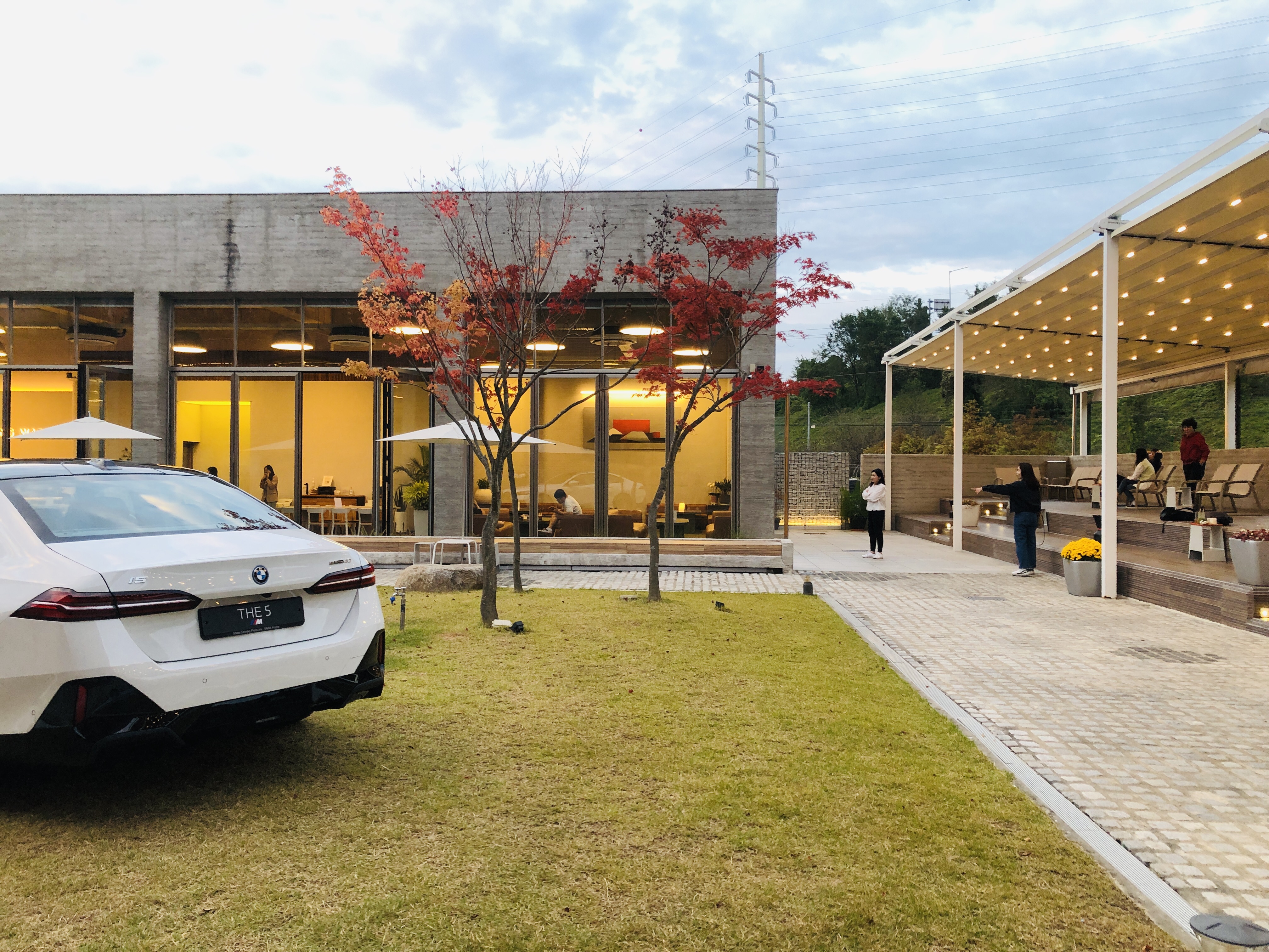 진주 로스팅웨어는 오롯이 중정과 내부 조경을 전망하도록 하고 있다. 그리고 내부 중정은 순환이 되는 동선으로 건물과 외부공간을 이어주고 있다. 100평(300㎡) 정도 되는 실내매장의 크기만큼 야외매장을 확보하고 있어 대형카페의 느낌이 물씬 든다.