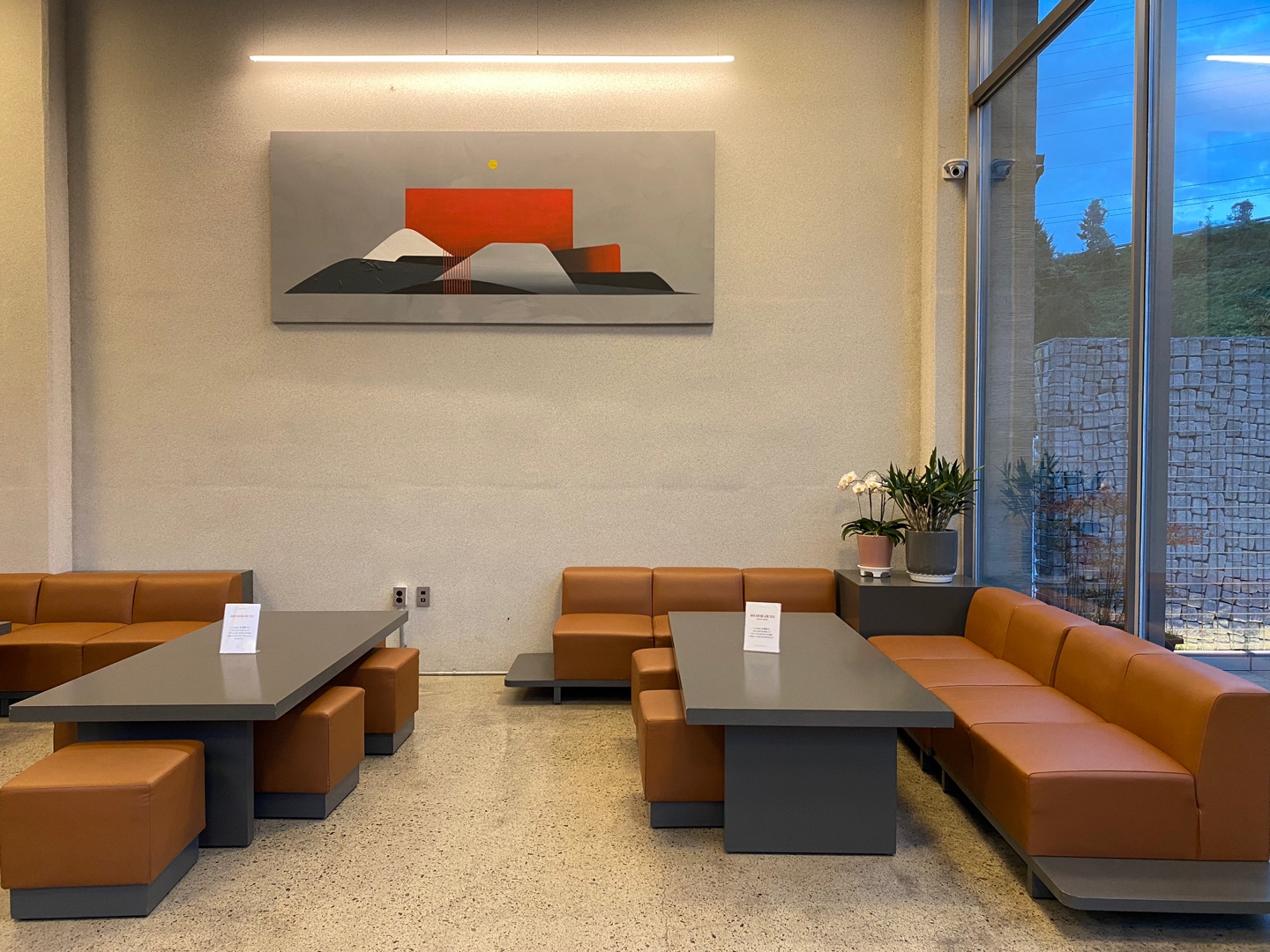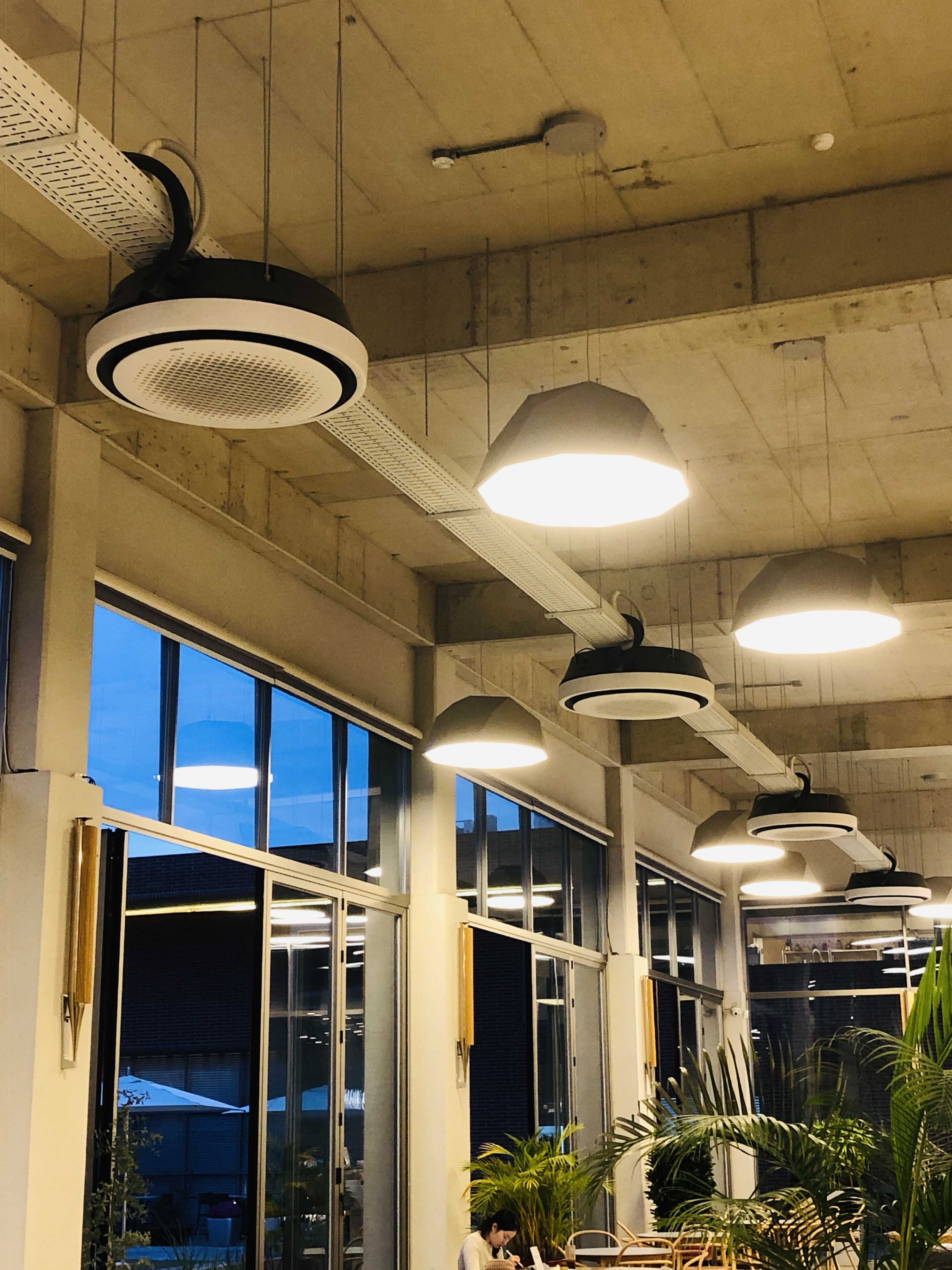 내부는 2개층 높이의 많이 높은 단층건물이며 천장은 노출콘크리트의 상태로 마감이 없이 거푸집의 간격을 정교하게 시공하였고 벽은 부분적으로 화장실과 데스크에 재료의 힘을 쏟았다. 천장 부분에서 재미있게 생각되는 부분은 천장에 매달려 있는 원형의 천장형 에어컨을 눈에 튀지 않게 하려고 에어컨 크기와 모양이 유사한 펜던트 조명을 사용한 것 같다. 제법 그럴듯해 보인다. 카페 중간에 위치한 화장실은 창이 전혀 없어 밝은 실내공간과 대비되는 효과와 주차장에서 카페를 바라보는 모습에서 창문하나 없는 건조한 표정을 짓도록 돕고 있다.