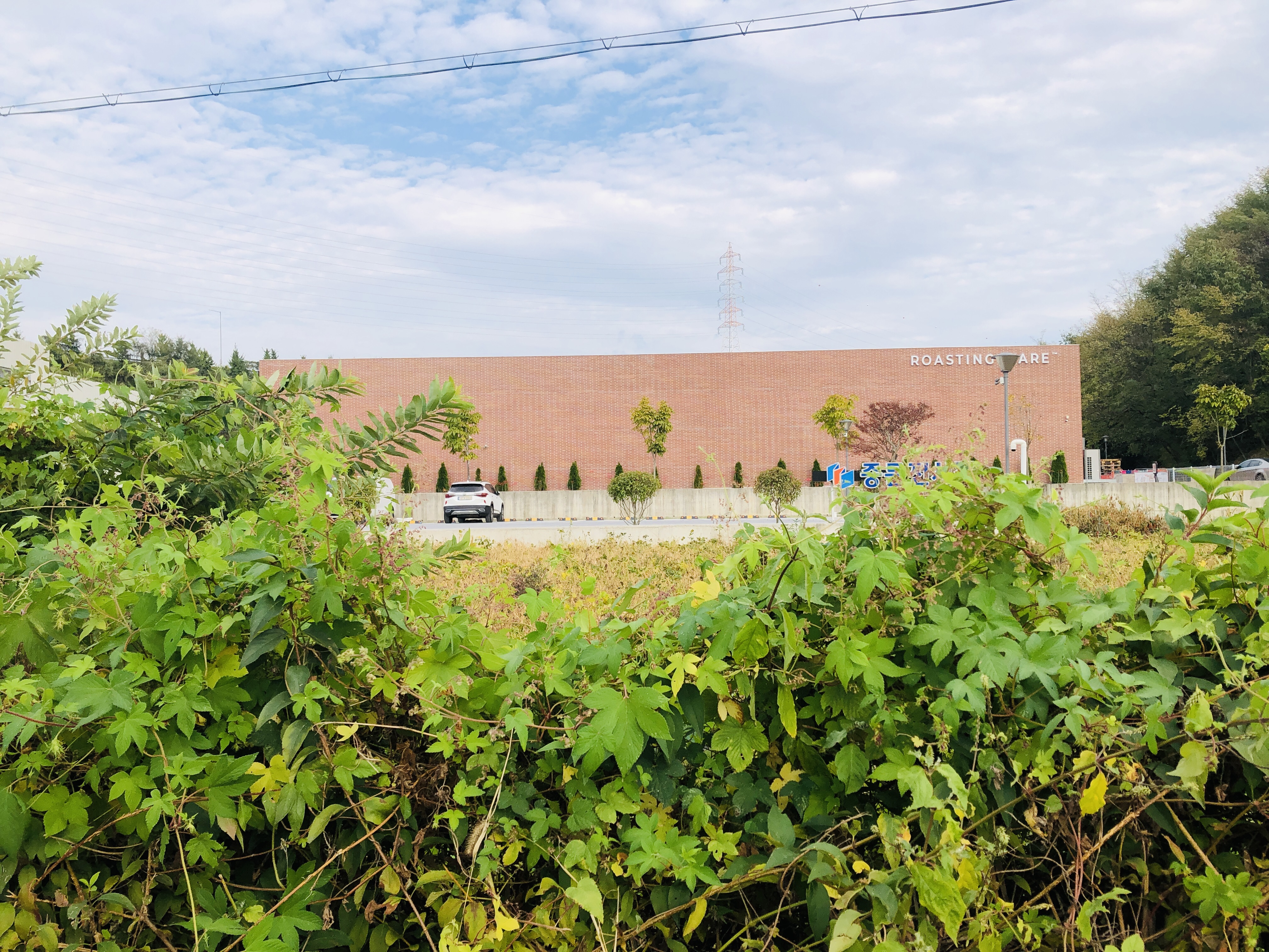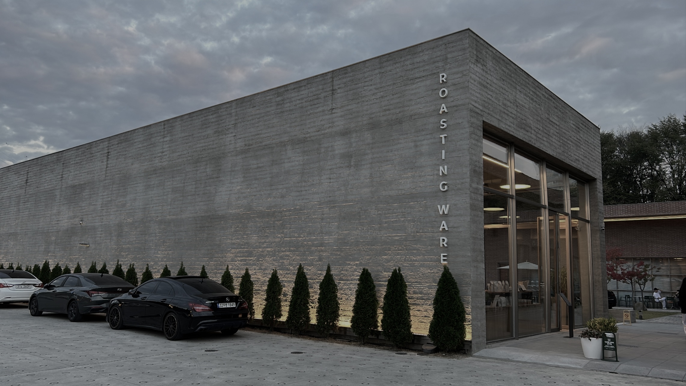 진주 로스팅웨어의 주차장과 건물은 서로 등을 돌린 채 건물의 모습을 숨기고 있다. 카페와 사무실(공장) 사이 띄워진 건물사이로 진입하여 카페에서는 주차장을 전혀 볼 수 없는 배치를 하고 있다. 미송무늬 노출콘크리트를 한 거친 재료가 주차장에서 떡하니 마주친다. 입구라고 볼 수 있는 곳이 건물과 건물사이 틈 밖에 없다. 자연스레 발걸음이 옮겨진다.