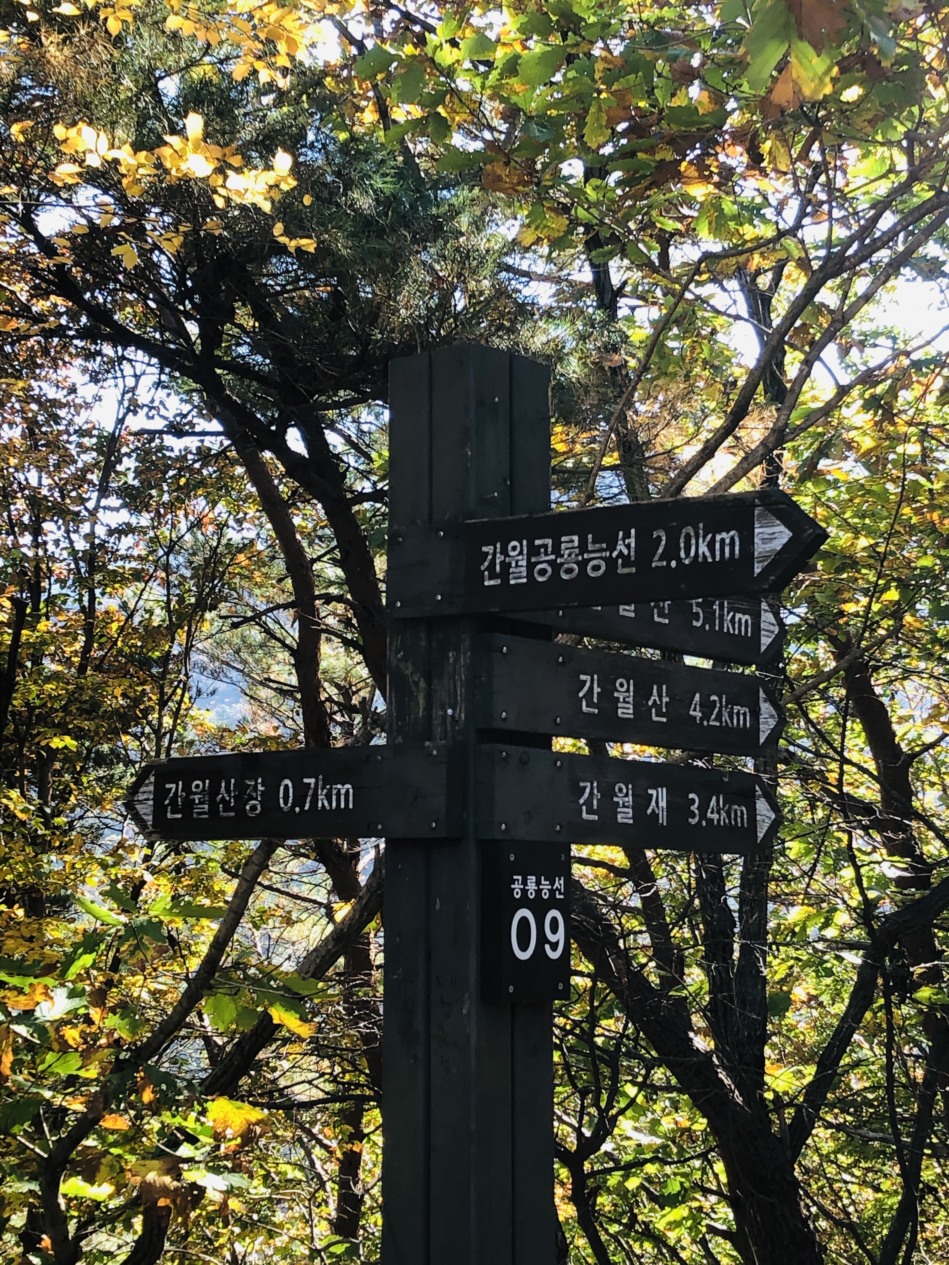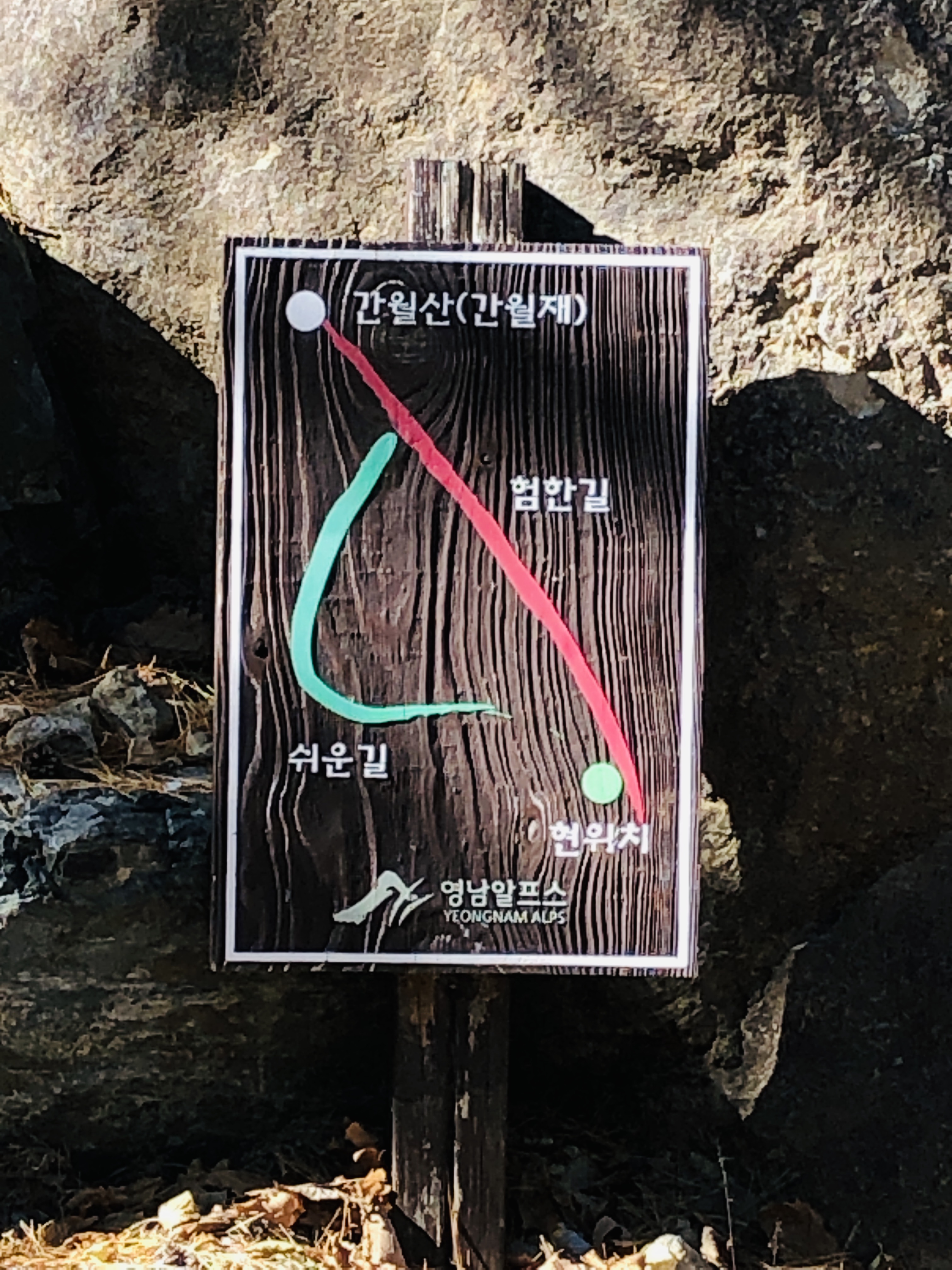 간월산 오르는 길에 몇 번의 험한 길 이정표가 나온다. 지도를 보니 임도가 너무 돌아가는 기분이 들어서 무작정 험한 길을 택하고 올랐다. 이정표에는 공룡능선 01~15번까지 있는 것 같은데, 09번에 험한길, 쉬운길 정하라고 하며, 길이 나누진다.