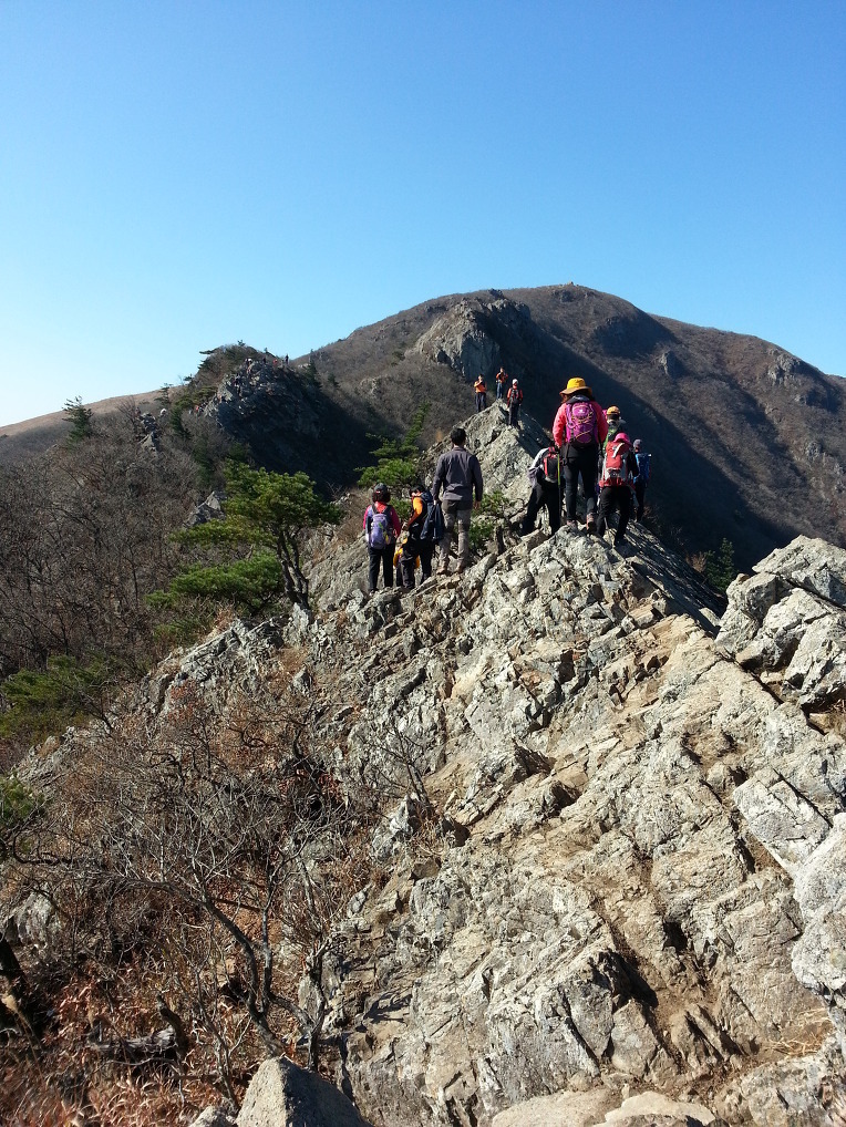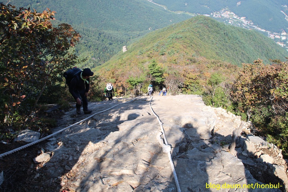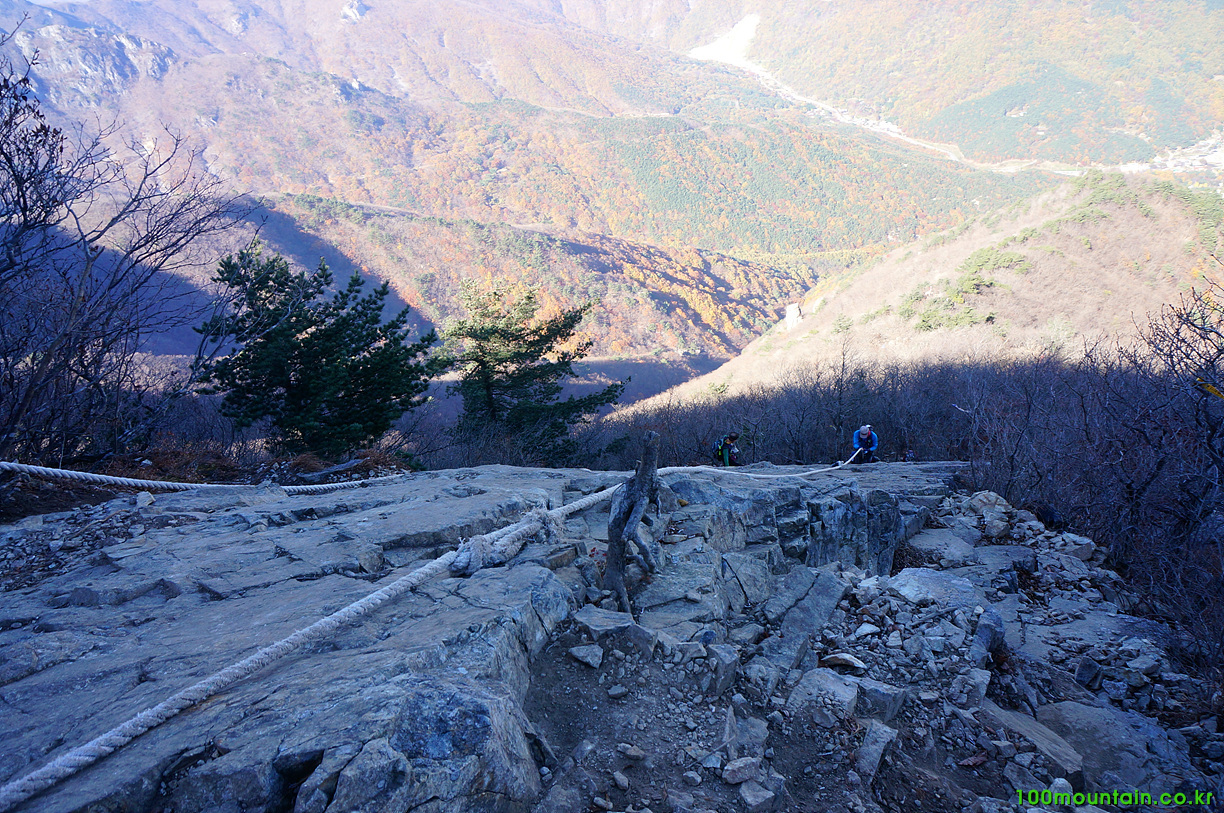 저는 사진을 찍지 못해 다른 산행 블로그의 이미지를 가져왔다. 경사가 심한 로프가 구간이 올라가면 갈수록 고소공포증이 올라온다. 해발고도 853m 지점에서 마지막 로프를 타지 못하고, 칼바위에 오르지 못하고 하산하게 되었다. 어떻게든 용기를 내어서 올랐다면, 아마 칼바위 공룡능선 위를 네 발로 기어서 엉금엉금 갔을지도 모르겠으나 네발로도 갈 수 도 없었다면, 다시 왔던 길을 로프를 타고 내려갈 수 도 없었을 것이다. 어찌 생각하면 거기까지만 딱 갔다가 내려온 게 잘한 선택일 지도 모르다고 생각한다. 구조대를 불러 헬기를 타게 되었을 생각을 하니 온몸이 오싹한 기분이 든다. 간월재는 다음에 임도로 가면 될 것이다.