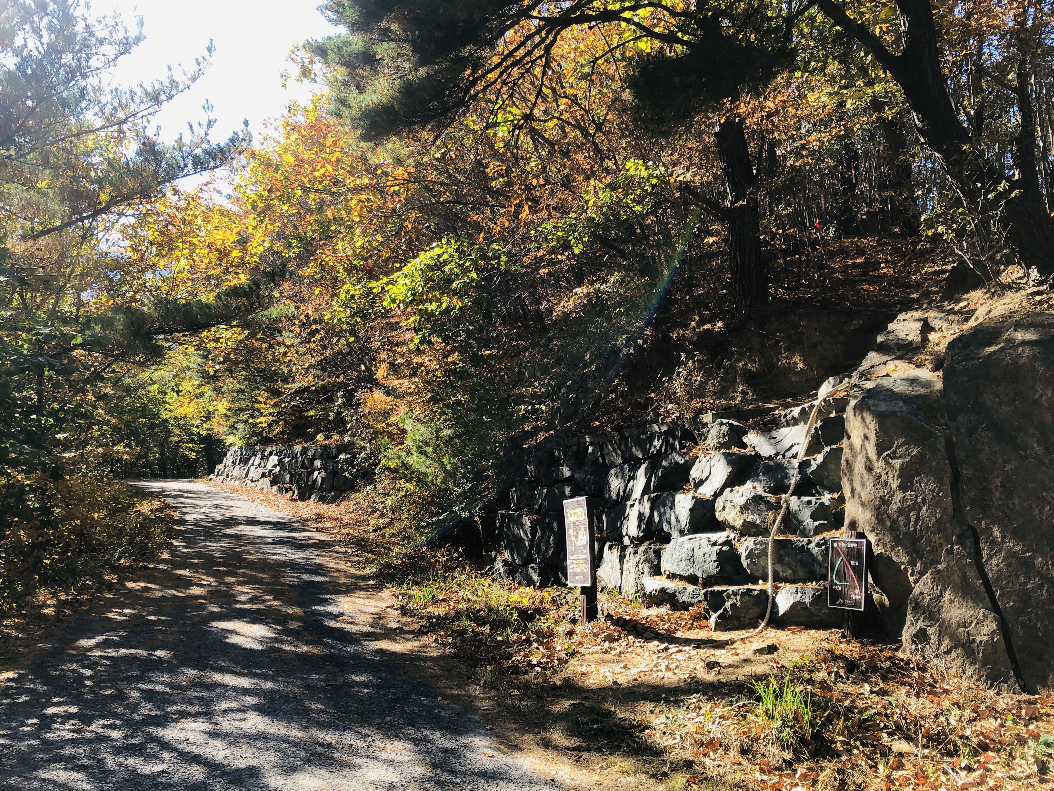 험한 길을 택하고 공룡능선으로 오르게 되는데, 시작은 좋았다. 그리고 가을산행에 스틱이 중요한 이유는 낙엽에 숨겨진 길을 미리 찔러보며 걸어야 하기 때문이다. 낙엽에 숨겨진 돌과 구덩이를 피하는 것이 부상을 줄이는데 중요하다. 땅만 보고 걷다가 길을 잃을 가능성이 높다. 어디가 길인지 아닌지 구분하기 힘들다.