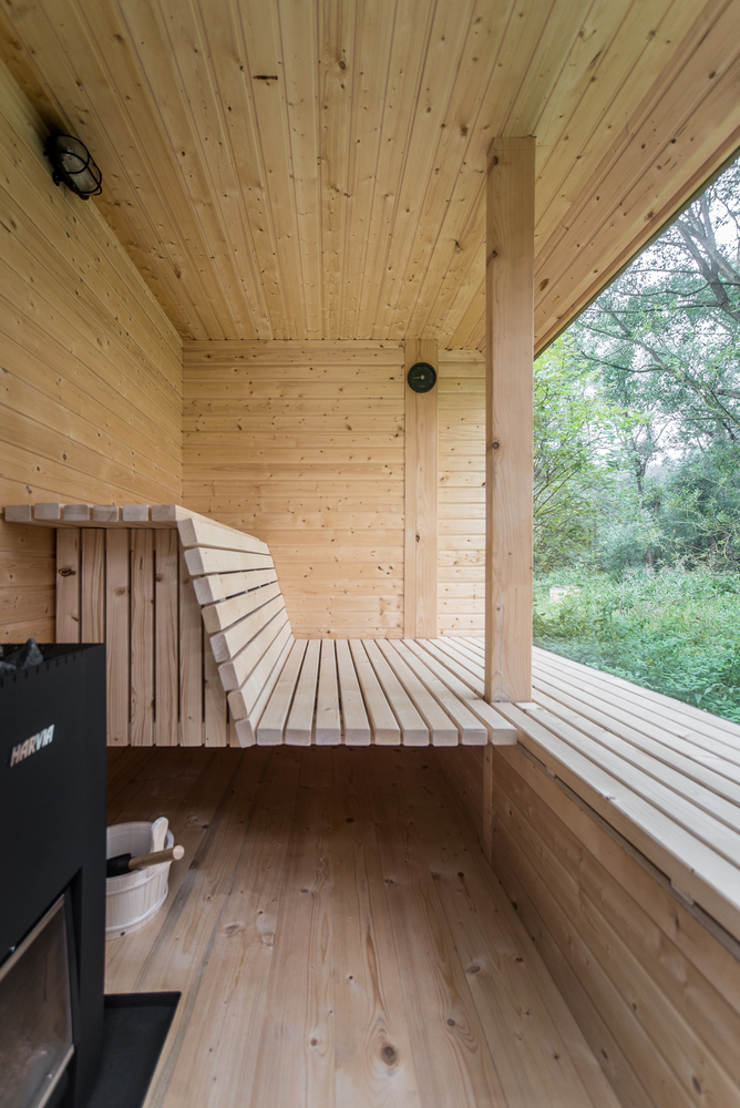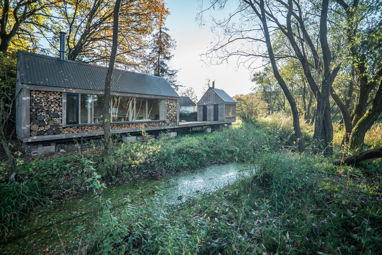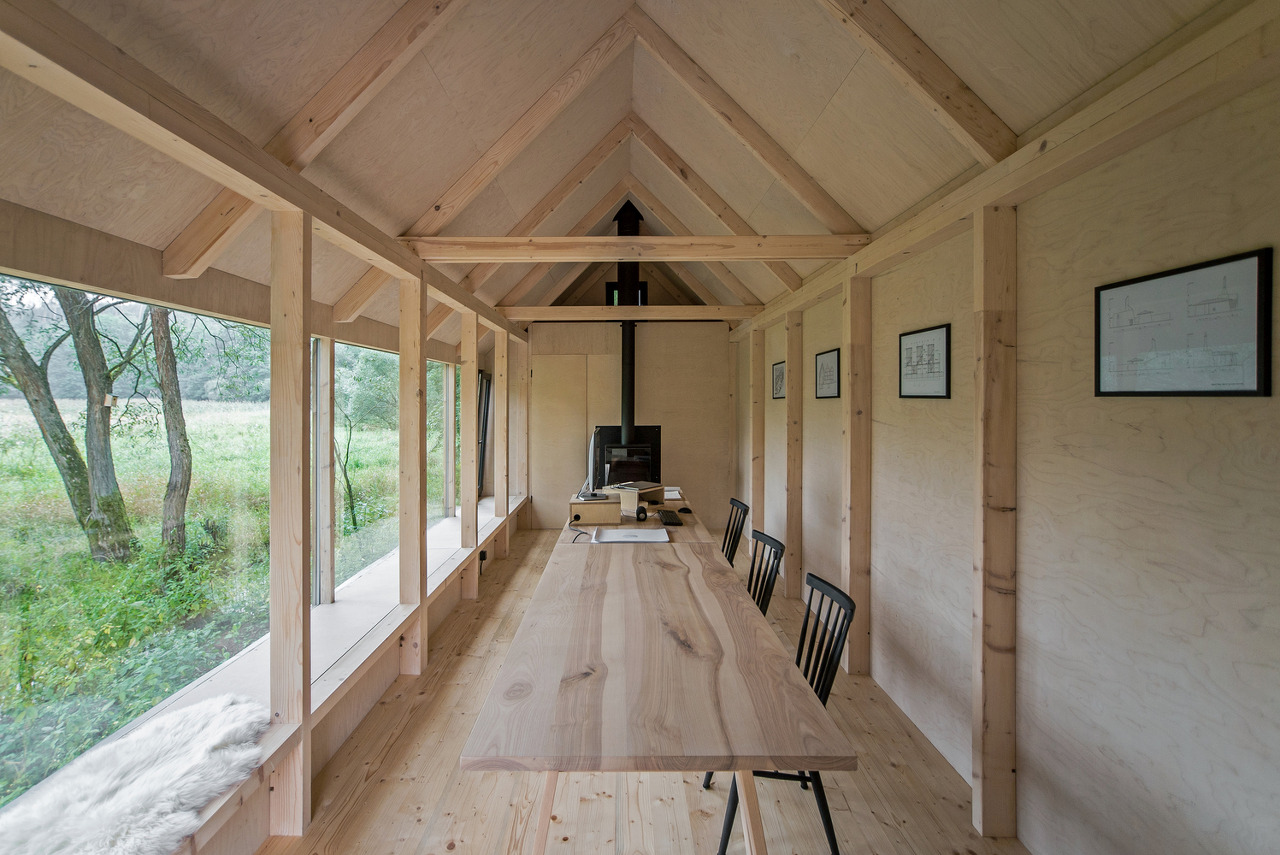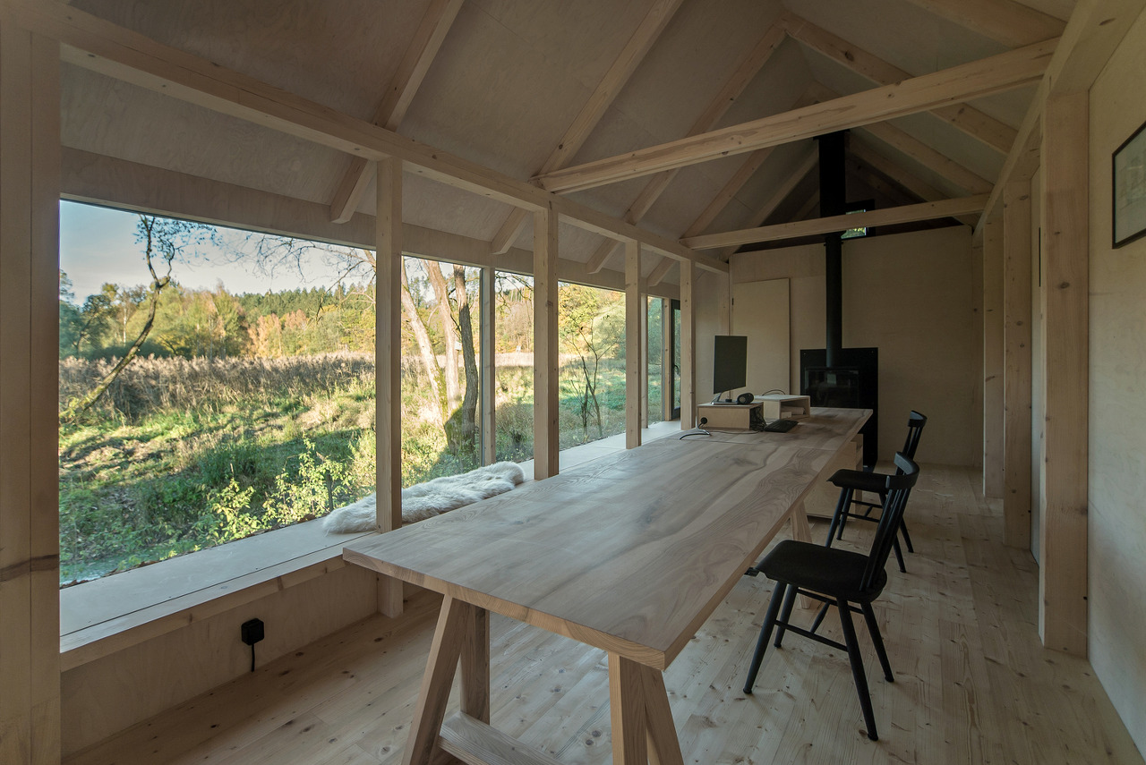 Text description provided by the architects. The building was created as an attempt to recycle materials that we had available from previous constructions and from family members who had stored them for decades - larch terrace boards, spruce facade boards, profiles for the construction of the foundations, windows, and most of the insulation materials. We were also able to borrow shroud boards, light equipment, etc., so the building was largely self-built with the help of friends and family. We wanted a three-season building that would be suitable for work, relaxation, family celebrations or as a "guest room". A building that would relate to the surrounding landscape with views across the valley from the former pond to the forest.