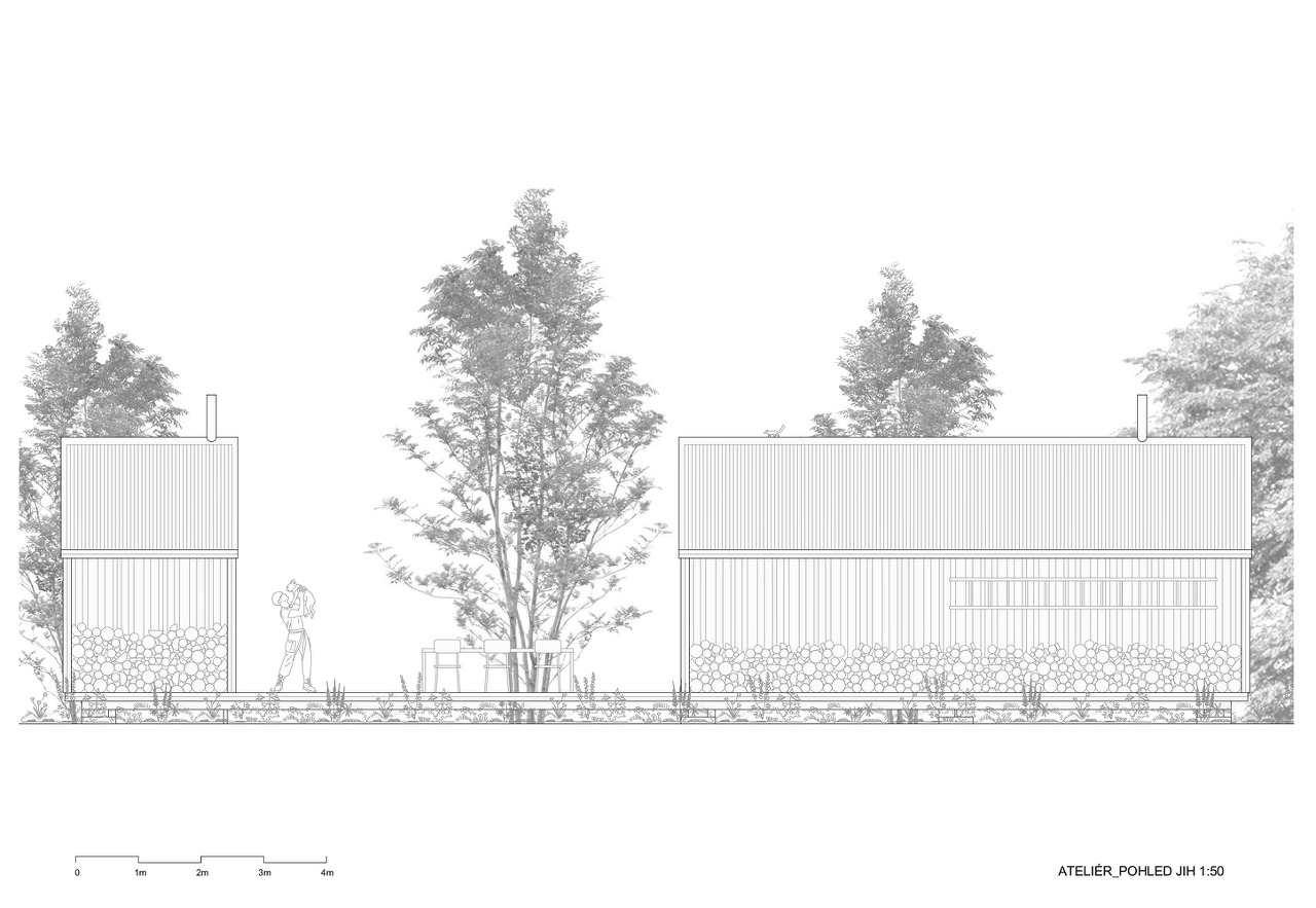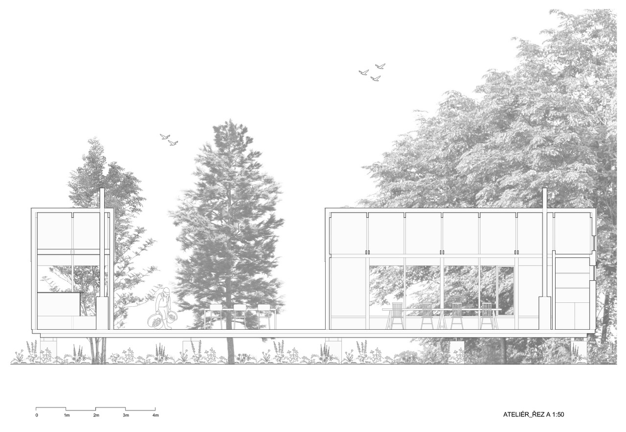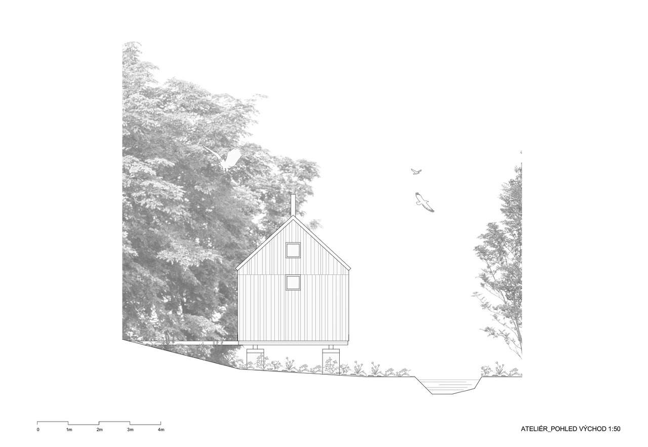 건물은 세 부분으로 구성되어 있다. "화장실을 갖춘 스튜디오-사우나-테라스(스튜디오와 사우나 사이)"의 세 가지 공간은 연못과 녹지를 전망하기 위한 선형의 매스로 박공의 지붕형태를 하고 있다.
