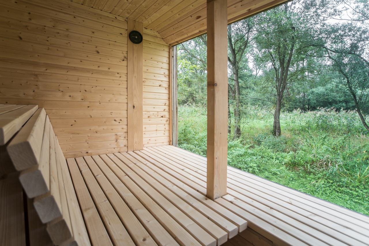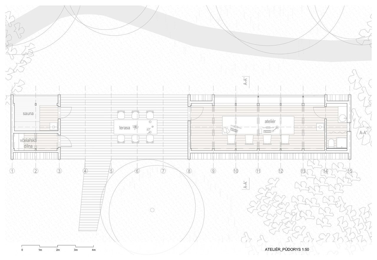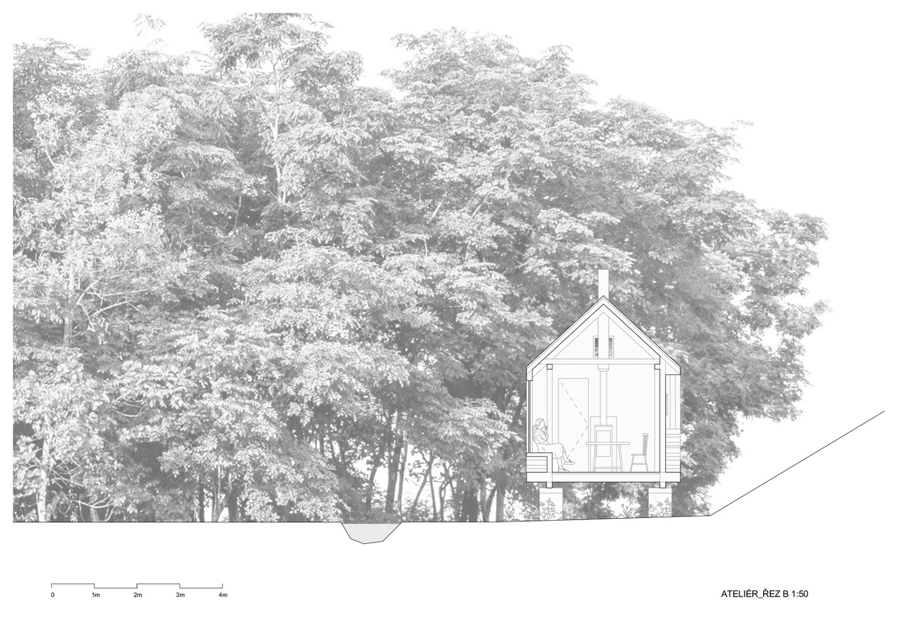 건물은 세 부분으로 구성되어 있다. "화장실을 갖춘 스튜디오-사우나-테라스(스튜디오와 사우나 사이)"의 세 가지 공간은 연못과 녹지를 전망하기 위한 선형의 매스로 박공의 지붕형태를 하고 있다.