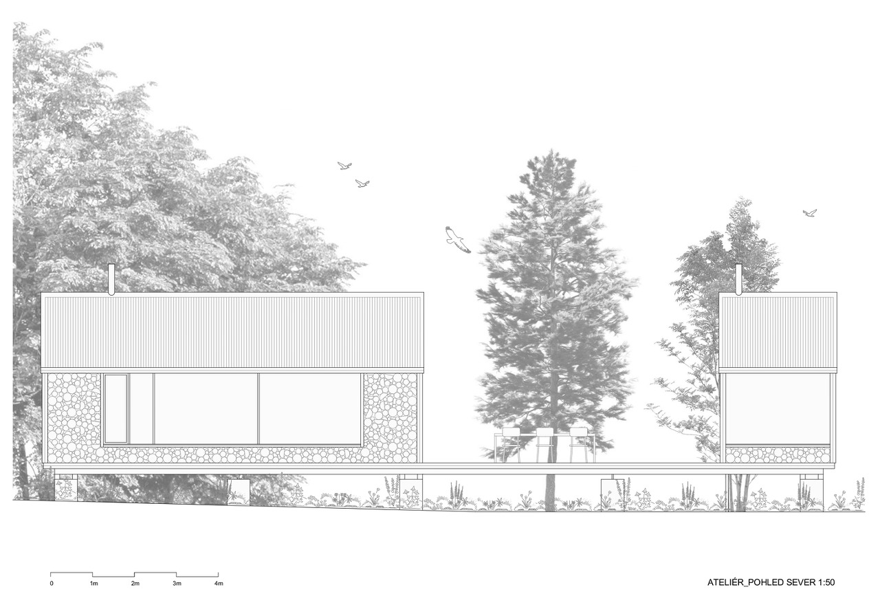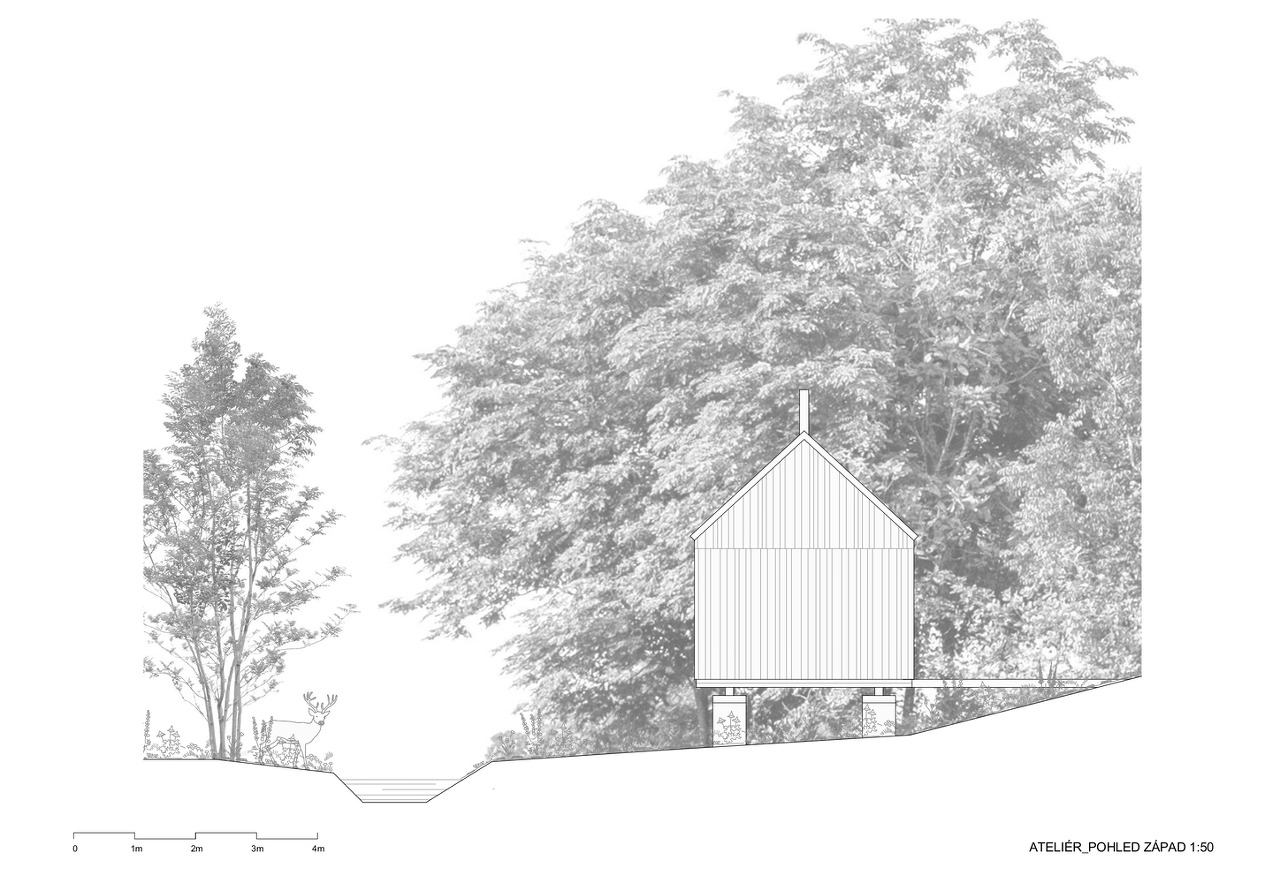 건물은 세 부분으로 구성되어 있다. "화장실을 갖춘 스튜디오-사우나-테라스(스튜디오와 사우나 사이)"의 세 가지 공간은 연못과 녹지를 전망하기 위한 선형의 매스로 박공의 지붕형태를 하고 있다.