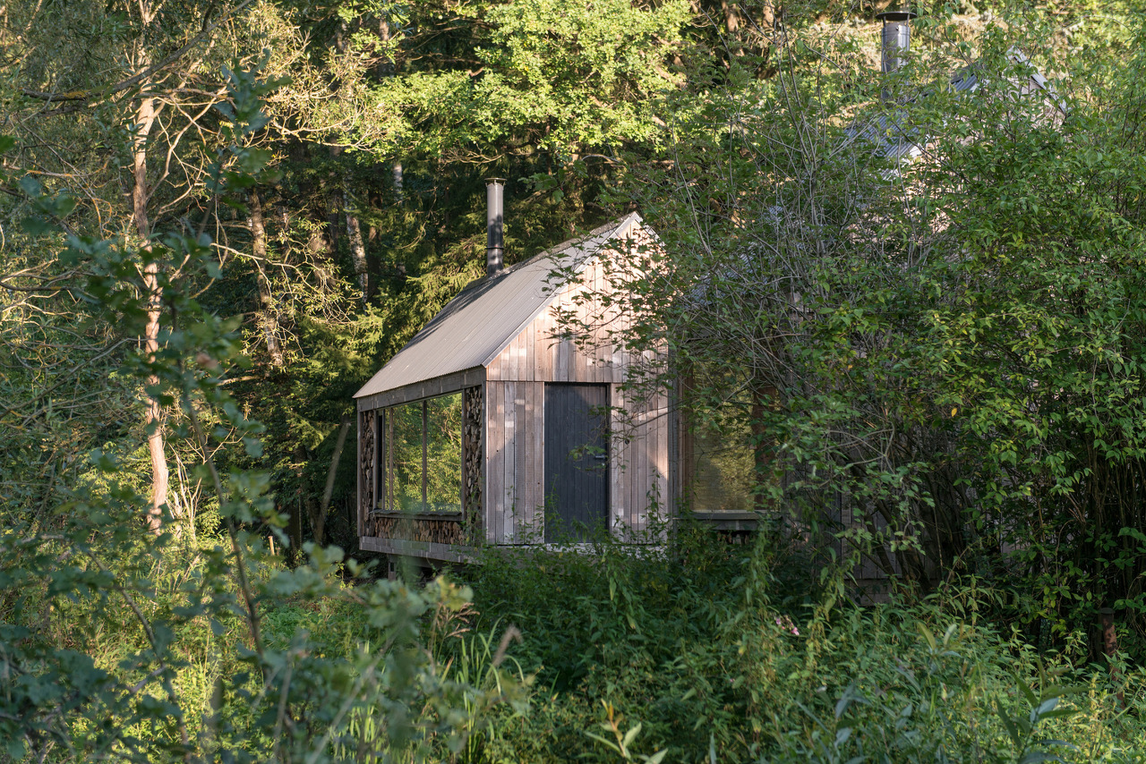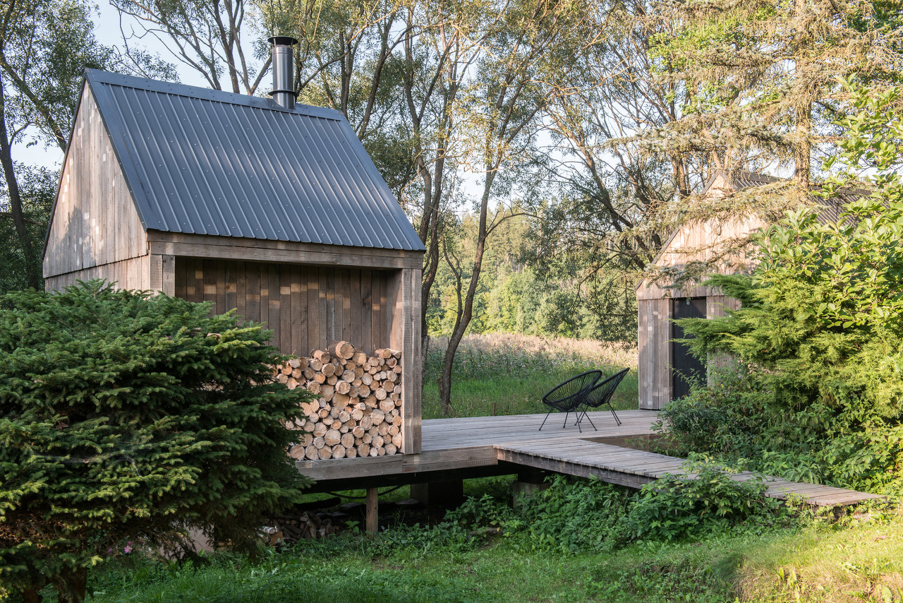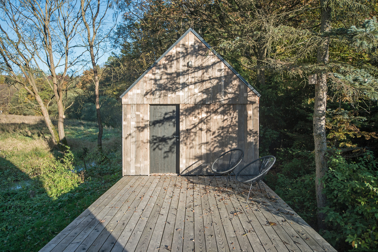 Text description provided by the architects. The building was created as an attempt to recycle materials that we had available from previous constructions and from family members who had stored them for decades - larch terrace boards, spruce facade boards, profiles for the construction of the foundations, windows, and most of the insulation materials. We were also able to borrow shroud boards, light equipment, etc., so the building was largely self-built with the help of friends and family. We wanted a three-season building that would be suitable for work, relaxation, family celebrations or as a "guest room". A building that would relate to the surrounding landscape with views across the valley from the former pond to the forest.