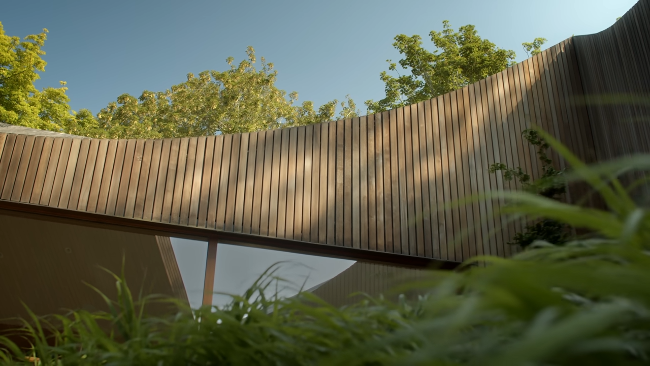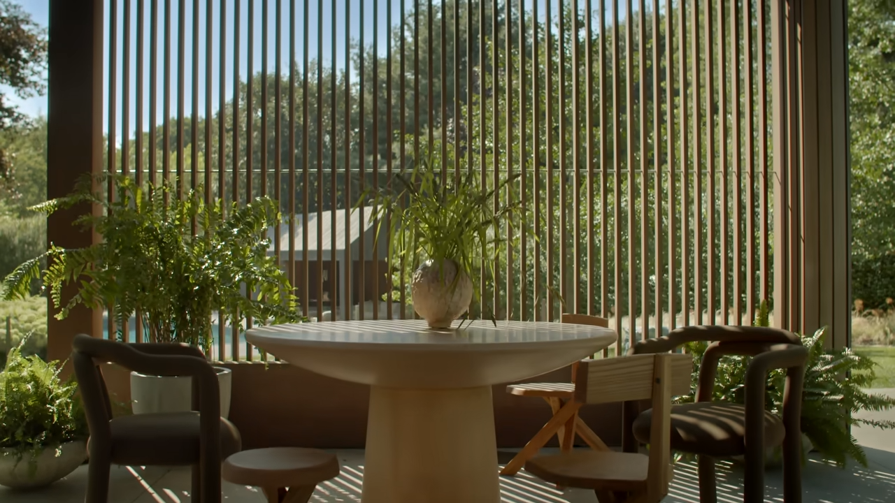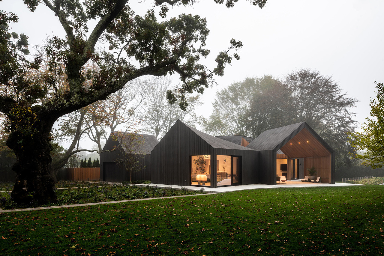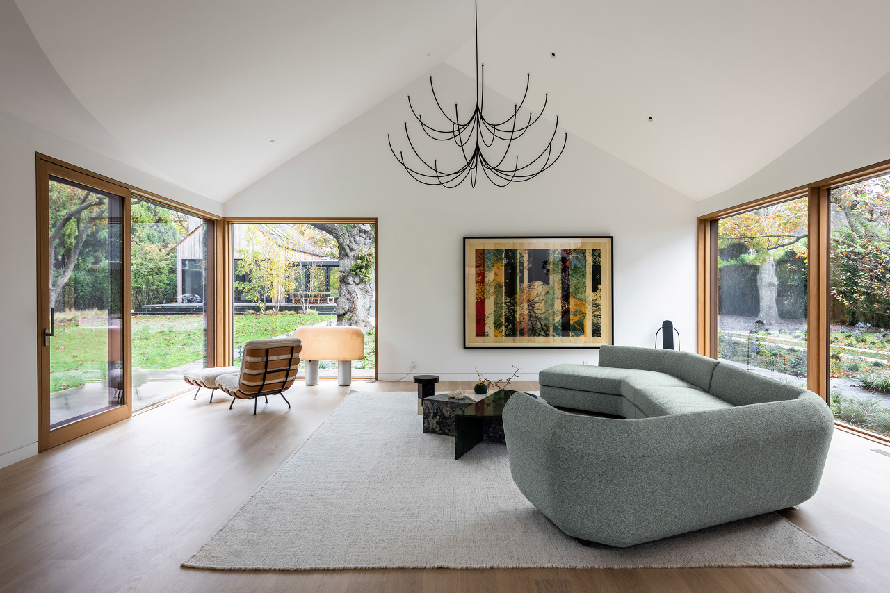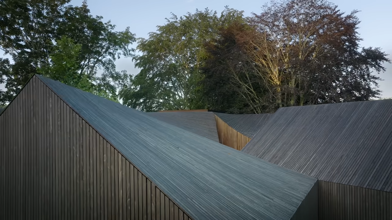 Set deep within a large plot, the house is defined by six cubes, tessellated from a central point to create a dynamic architecture amidst lush gardens. As architect Bryan Young puts it, "The gable modules are arranged to align the roof ridges and create continuity from one module to the next." Modern forms connect with nature in many ways. The cubic volume has openings that serve as passageways to the garden. The holes inside frame the landscape. The interior courtyard, captured on a tour of the home, features garden beds beneath a wooden pavilion. It is holistic and intentional. This is the effect you get when an architect designs a breathtakingly beautiful home.