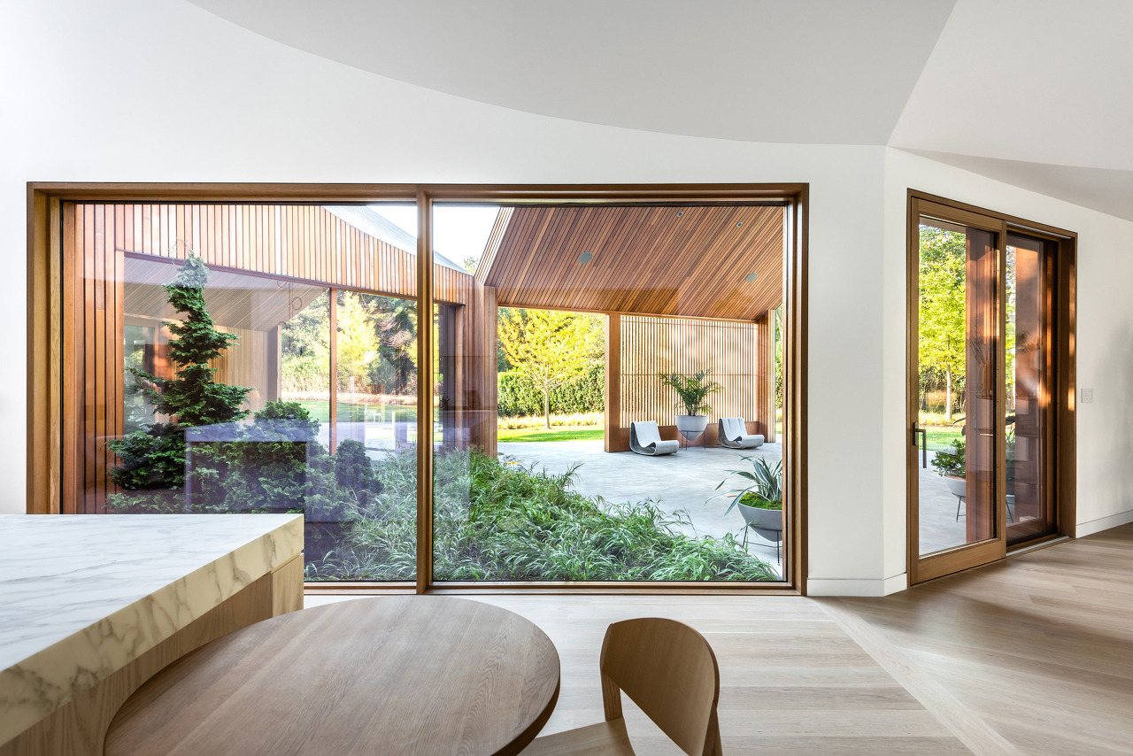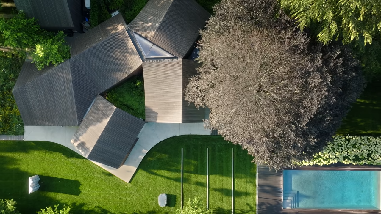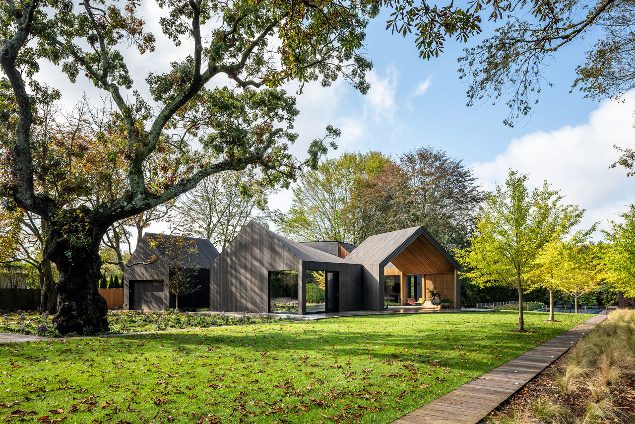 Set deep within a large plot, the house is defined by six cubes, tessellated from a central point to create a dynamic architecture amidst lush gardens. As architect Bryan Young puts it, "The gable modules are arranged to align the roof ridges and create continuity from one module to the next." Modern forms connect with nature in many ways. The cubic volume has openings that serve as passageways to the garden. The holes inside frame the landscape. The interior courtyard, captured on a tour of the home, features garden beds beneath a wooden pavilion. It is holistic and intentional. This is the effect you get when an architect designs a breathtakingly beautiful home.
