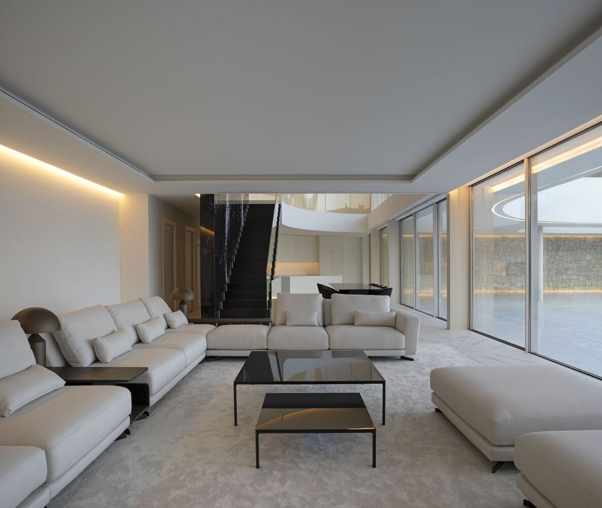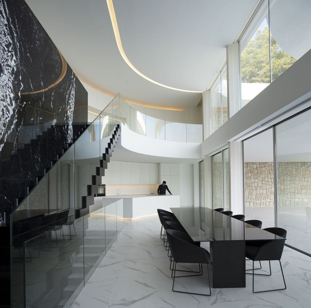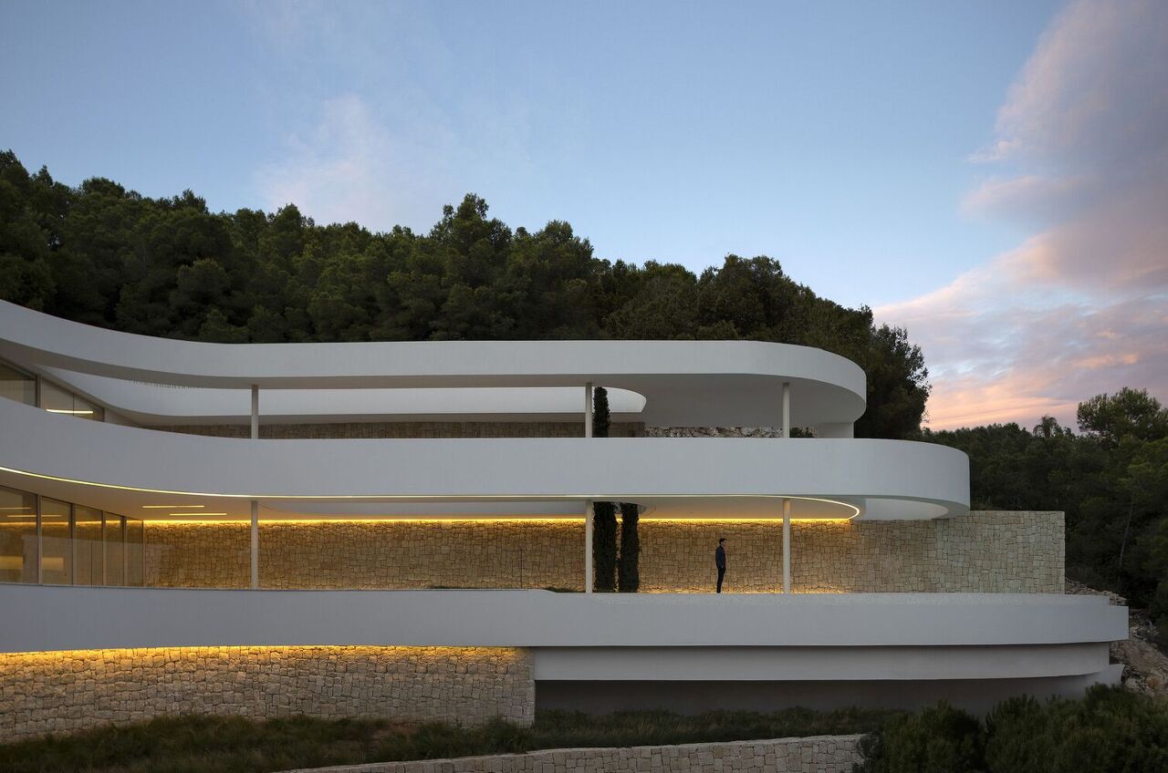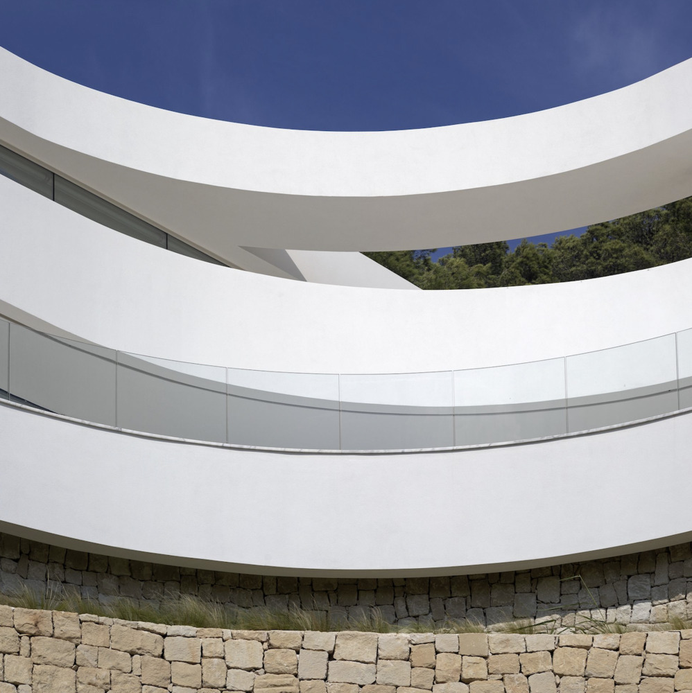 Portitxol만을 남동쪽으로 내려다보는 가파른 경사면에 위치하여 지형적인 문제를 가지고 있지만 동시에 전망을 가진 주택이다. 집은 자연적인 경사지형과 함께 지형에 적응하며 미끄러지듯 구불구불한 방식으로 디자인을 풀어낸다. 내외부의 경계를 모호하게 하기위해 외피의 유리를 연속적이고 창문프레임의 갯수를 최소화한 방식을 선택했다. 이 방식은 외부의 풍경을 실내로 끌어들이기 위함이고 동시에 내부의 공간을 외부로 확장하고 있다. 수평으로 뻗어가는 수평선과 함께 건물의 수평성도 강조하고 있다. 수평선은 흰색의 회반죽으로 단정하게 하고 층과 층의 외벽은 석재를 쌓아 땅의 모습과 어우러지게 하여 수평선이 마치 공중에 떠 있는 듯한 기분이 들도록 의도하였다. 그리고 그 수평선의 떠 받치는 기둥은 원형의 얇은 두께로 기둥의 존재감을 최소화하고 수평선을 한층 강조했다.