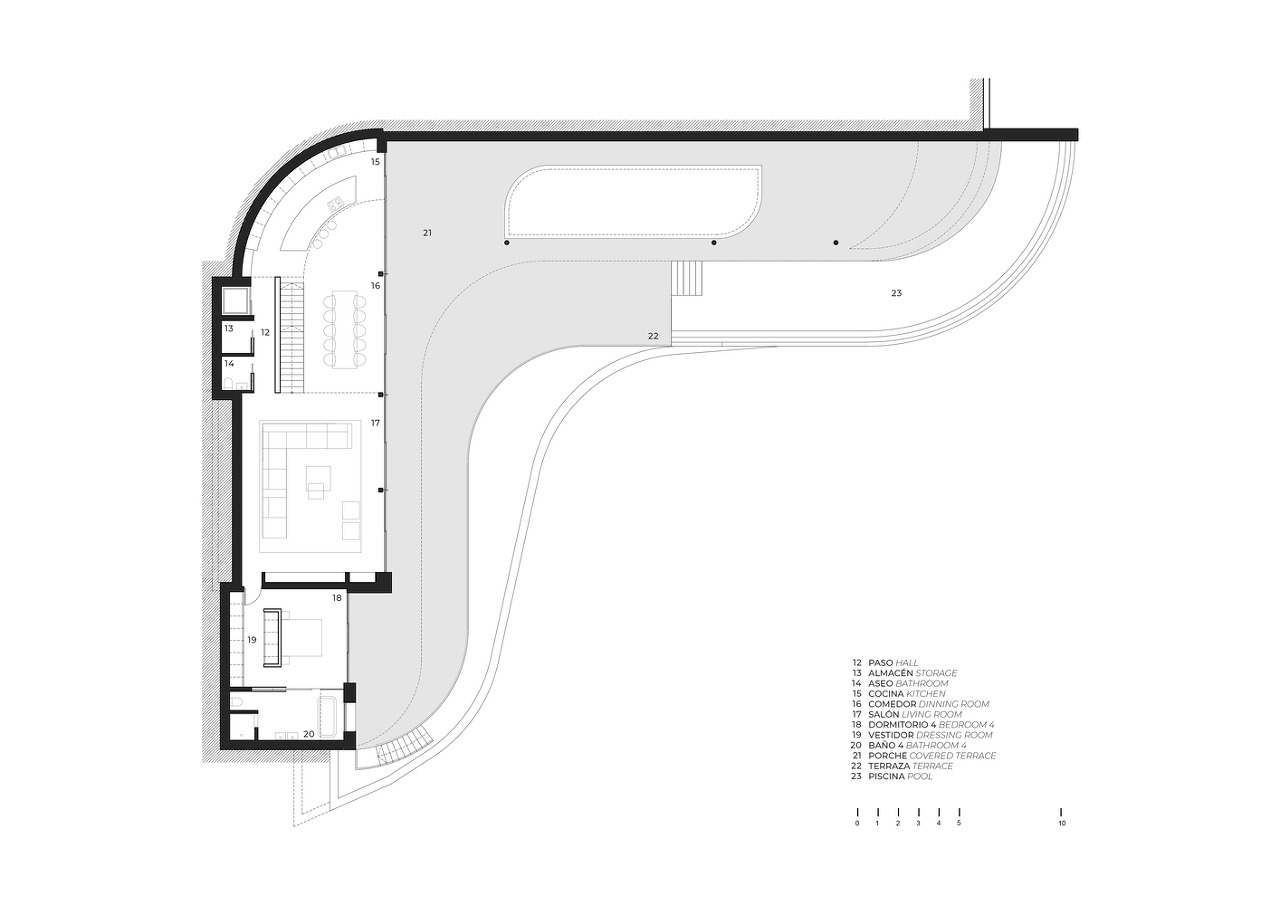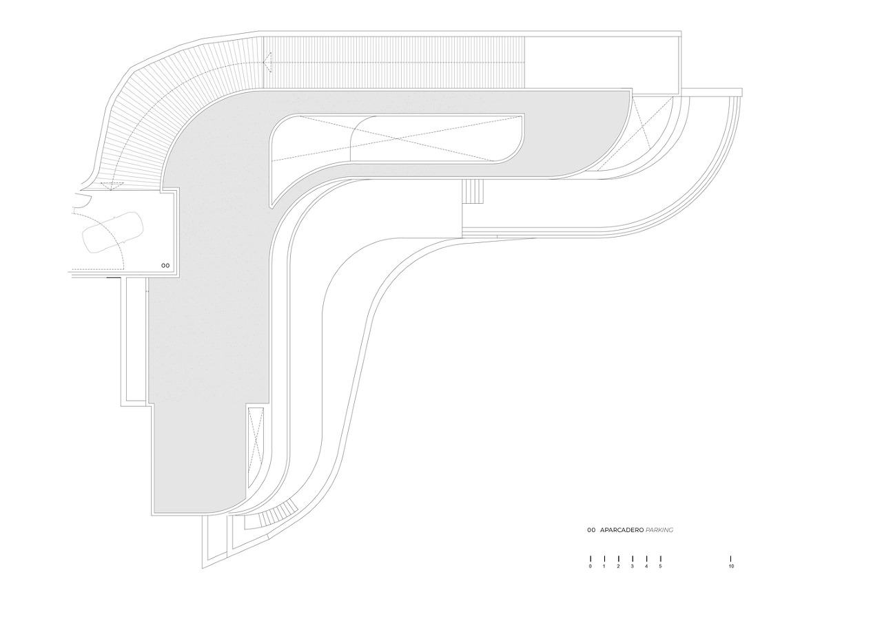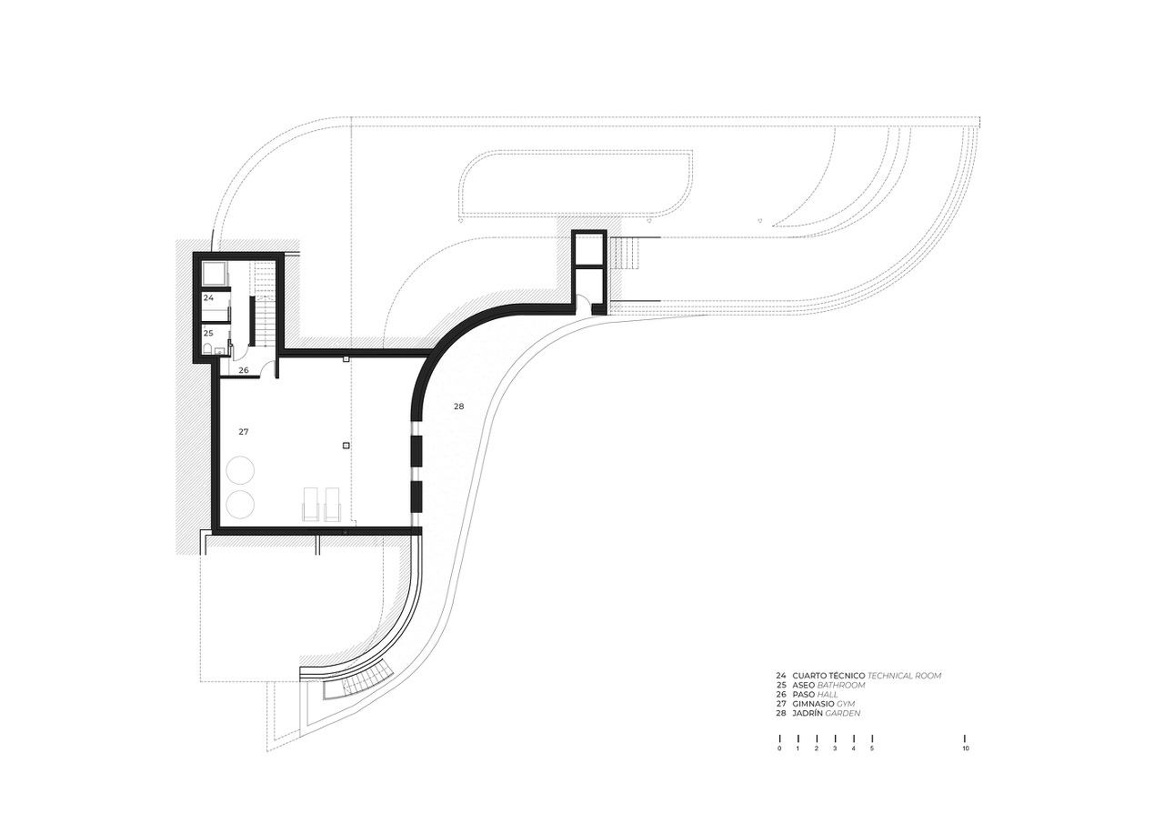 Portitxol만을 남동쪽으로 내려다보는 가파른 경사면에 위치하여 지형적인 문제를 가지고 있지만 동시에 전망을 가진 주택이다. 집은 자연적인 경사지형과 함께 지형에 적응하며 미끄러지듯 구불구불한 방식으로 디자인을 풀어낸다. 내외부의 경계를 모호하게 하기위해 외피의 유리를 연속적이고 창문프레임의 갯수를 최소화한 방식을 선택했다. 이 방식은 외부의 풍경을 실내로 끌어들이기 위함이고 동시에 내부의 공간을 외부로 확장하고 있다. 수평으로 뻗어가는 수평선과 함께 건물의 수평성도 강조하고 있다. 수평선은 흰색의 회반죽으로 단정하게 하고 층과 층의 외벽은 석재를 쌓아 땅의 모습과 어우러지게 하여 수평선이 마치 공중에 떠 있는 듯한 기분이 들도록 의도하였다. 그리고 그 수평선의 떠 받치는 기둥은 원형의 얇은 두께로 기둥의 존재감을 최소화하고 수평선을 한층 강조했다.