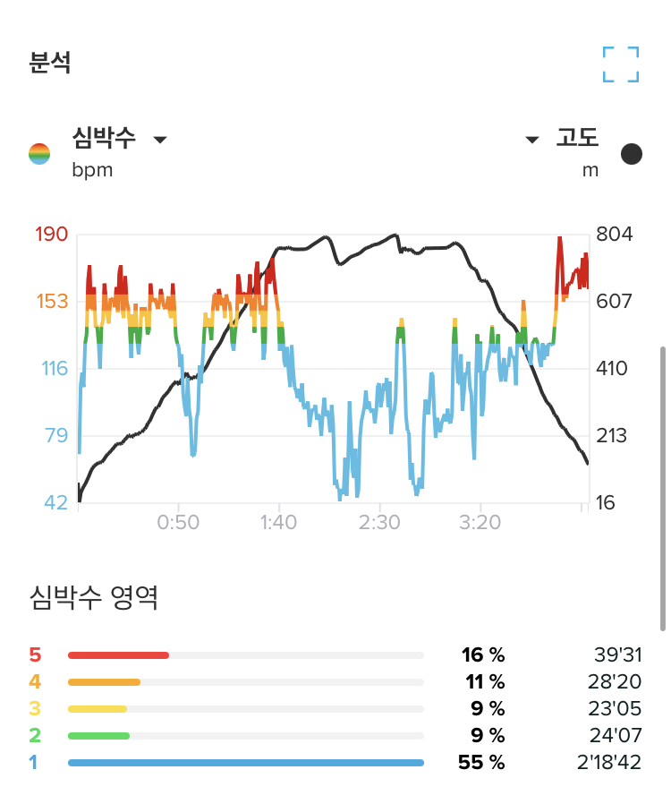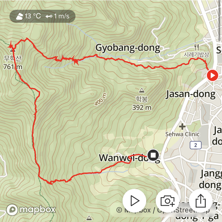 시간: 4시간 13분( 정상에서 한시간 멍때림 ), 오르막 1시간 40분, 내리막 1시간 20분