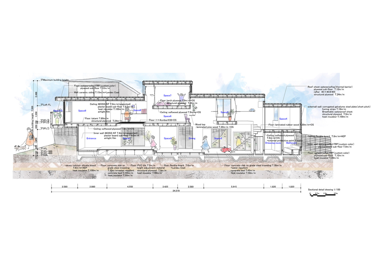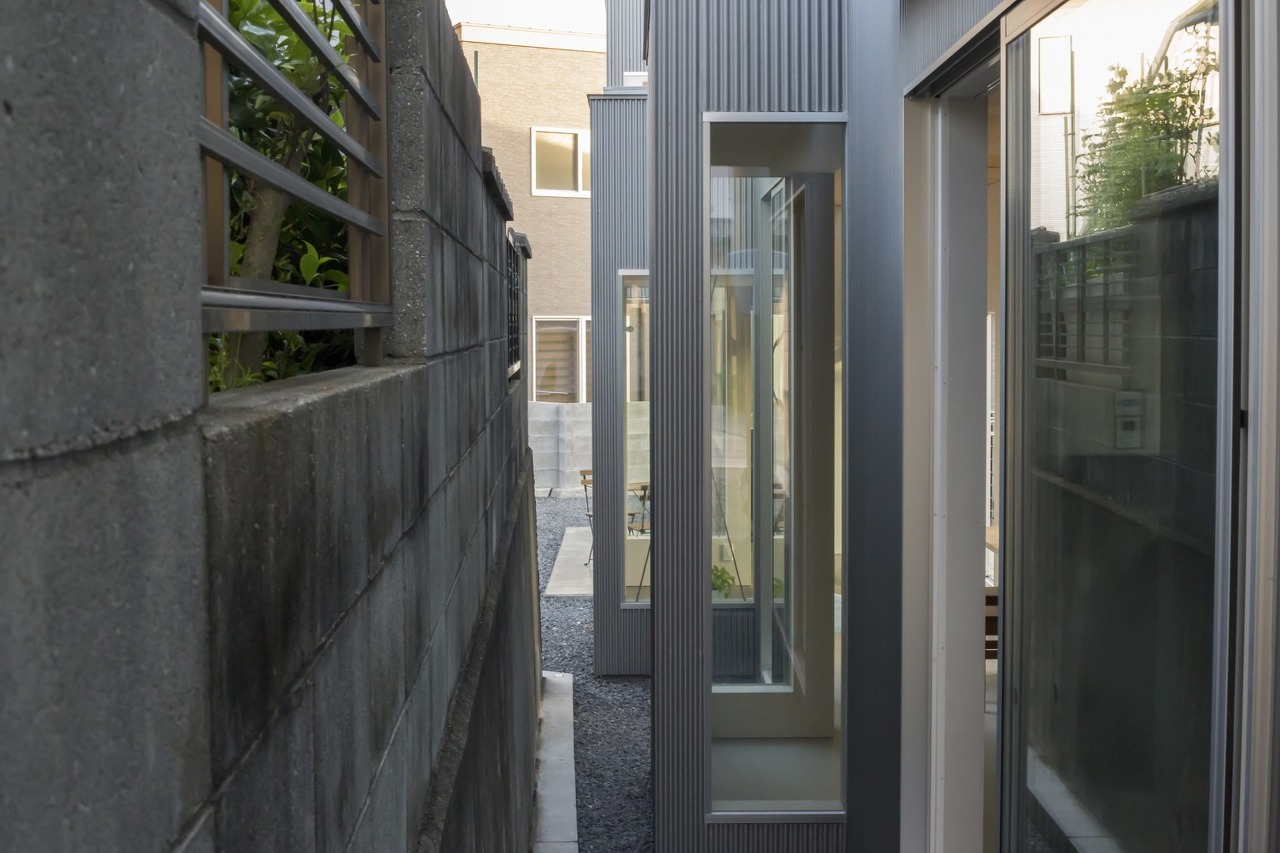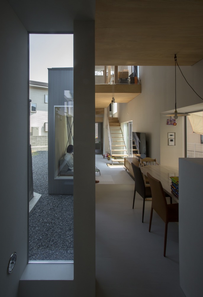 Text description provided by the architects. The house is on one of the plots of a large developed field in the Japanese countryside. The site was surrounded by long, narrow, distorted roads that had existed for a long time, and the land had a deformed flagpole shape. As a result, variously angled property boundaries and buildings surrounded the site, and no matter where one stood on the site, one felt a tenuous relationship with the neighboring land. This project attempted to create a new relationship with the outside, including the neighboring land, by designing the distance between the building and the site boundary on a deformed flagpole lot with distorted contours. Specifically, a 1.8m wide elongated volume is placed to penetrate the flag and pole portions of the deformed flagpole site. By doing so, an interior space with a strong axis is created in the deformed site, and all the spaces can have exterior wall surfaces with a close distance on both the east and west sides. While adjusting the relationship with the neighboring land, the openings that lead to the outside and the places that bulge out slightly from the axis that serve as gathering places are placed there.