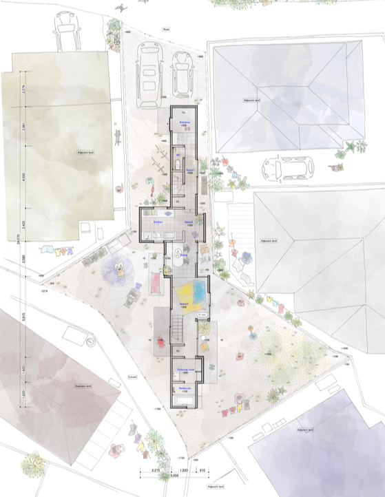 ▶좁고 긴 방향의 협소주택 | 스킵플로어 방식으로 단조로움을 해결한 주택