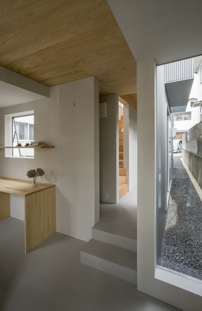 협소주택의 방식은 다양할 수 있는데, 이번 협소주택은 대지의 모양이 협소주택의 방식으로 따르지 않아도 되는데, 그렇게 한 것에 대해서 의문을 품게 되었다. 진입부는 차량두대 주차하면 가득차는 정도의 공간과 안쪽으로 들어갈 수록 주변 집들로 둘러쌓여진 조금은 넓은 대지를 가지고 있다. 진입의 폭1.8미터 남짓한 건물의 볼륨으로 길고 강한 축을 만들고 내부공간은 동쪽과 서쪽이 관통되는 홑집의 구조이다. 좁고 긴 협소주택은 방, 거실 등 단위공간으로만 연속될 수 밖에 없는 크기이며 스킵플로어 방식으로 가족간의 적당한 거리감과 이웃대지와의 입체적 관계를 만들어 내고 있다. 창의 방향은 이웃의 집과 간섭이 없도록 측면 창과 고창을 주로 사용하고 있으며 도시의 새로운 풍경을 만들어 내고 있다.