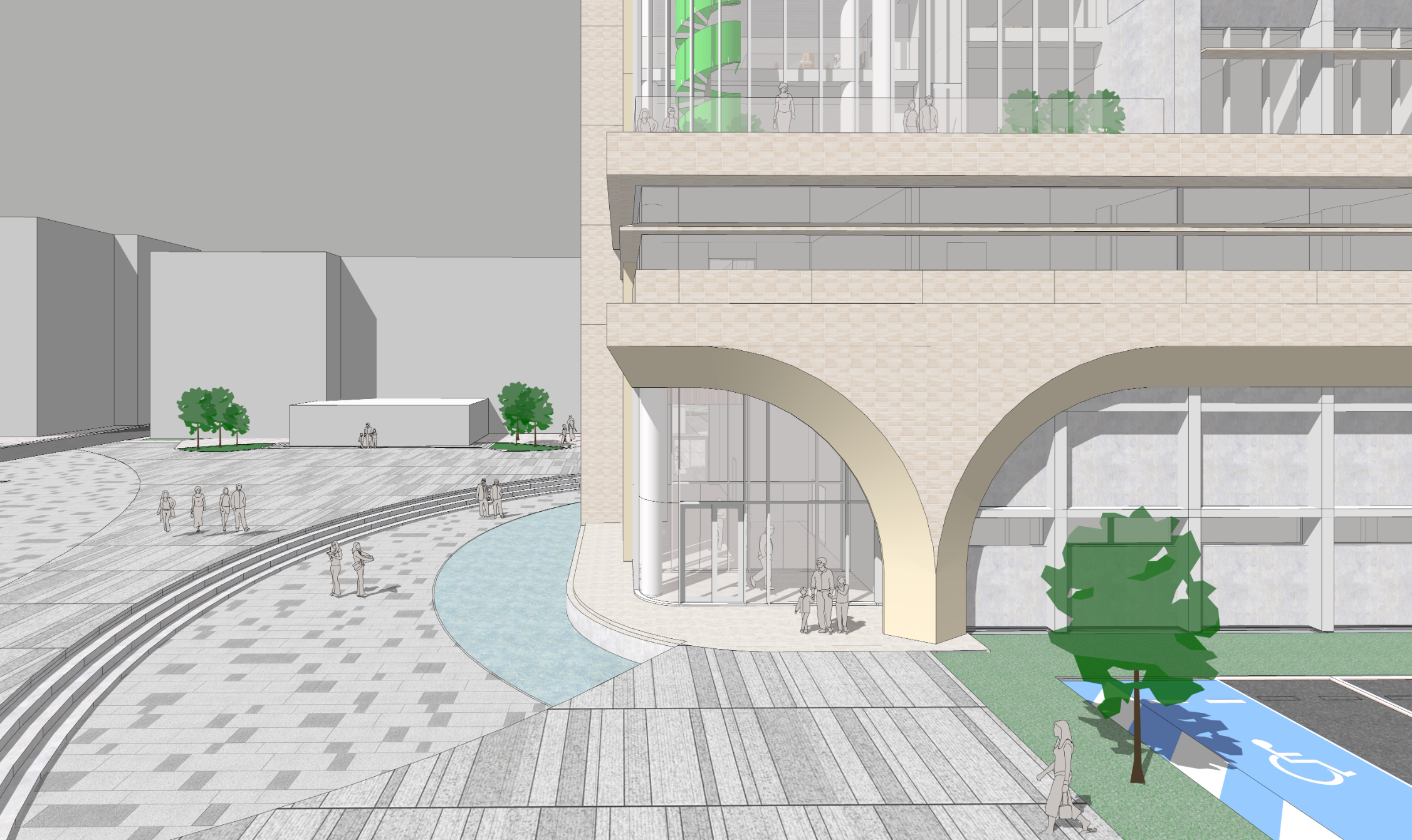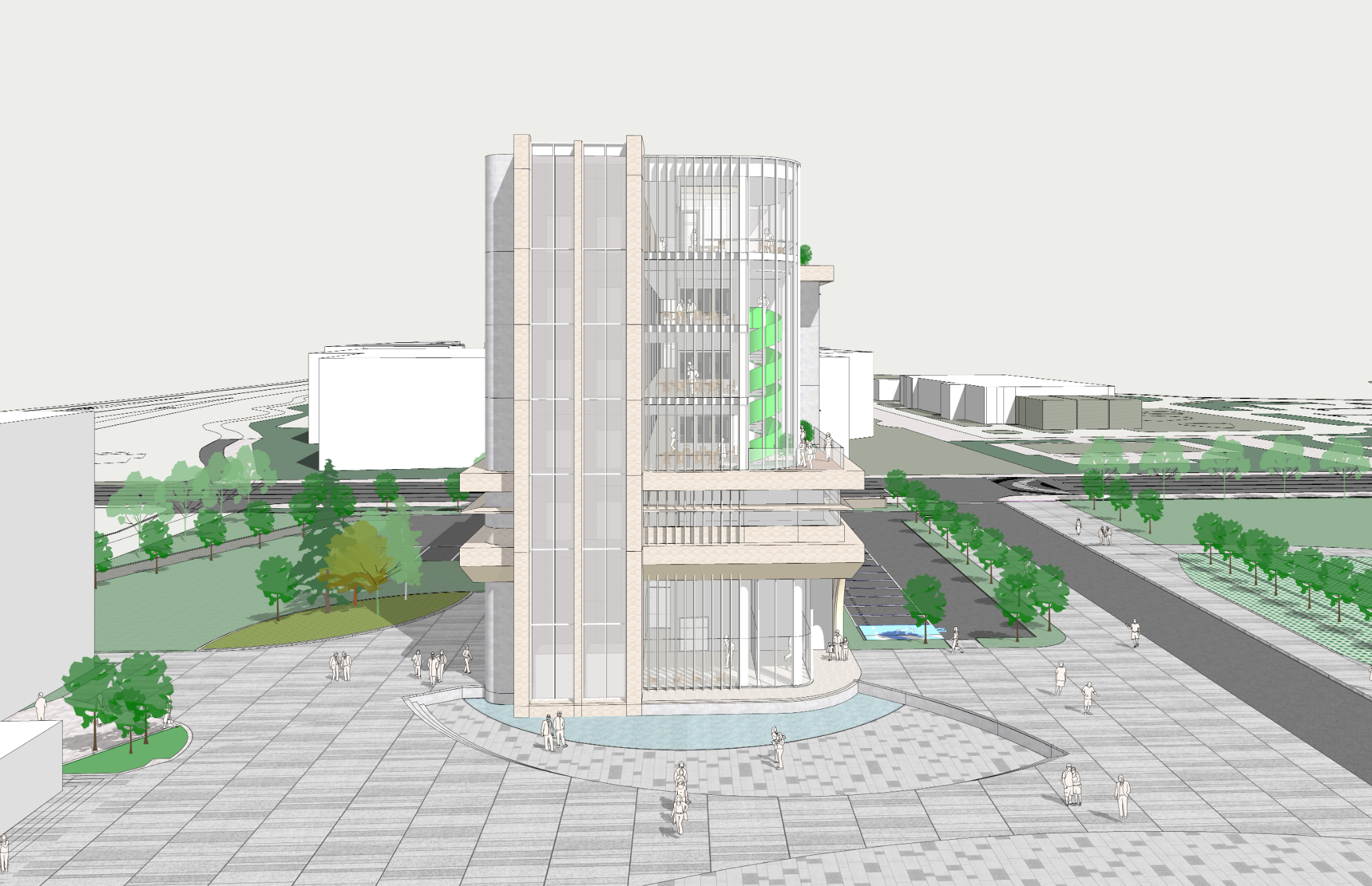 저층부: 1층의 생산지원과 2층의 연구중심공간의 생명공학기술은 나무가 토양의 영양분과 물(수공간)을 흡수해 수직/수평적으로 성장 해나가는 디자인을 저층에 적용하였다.