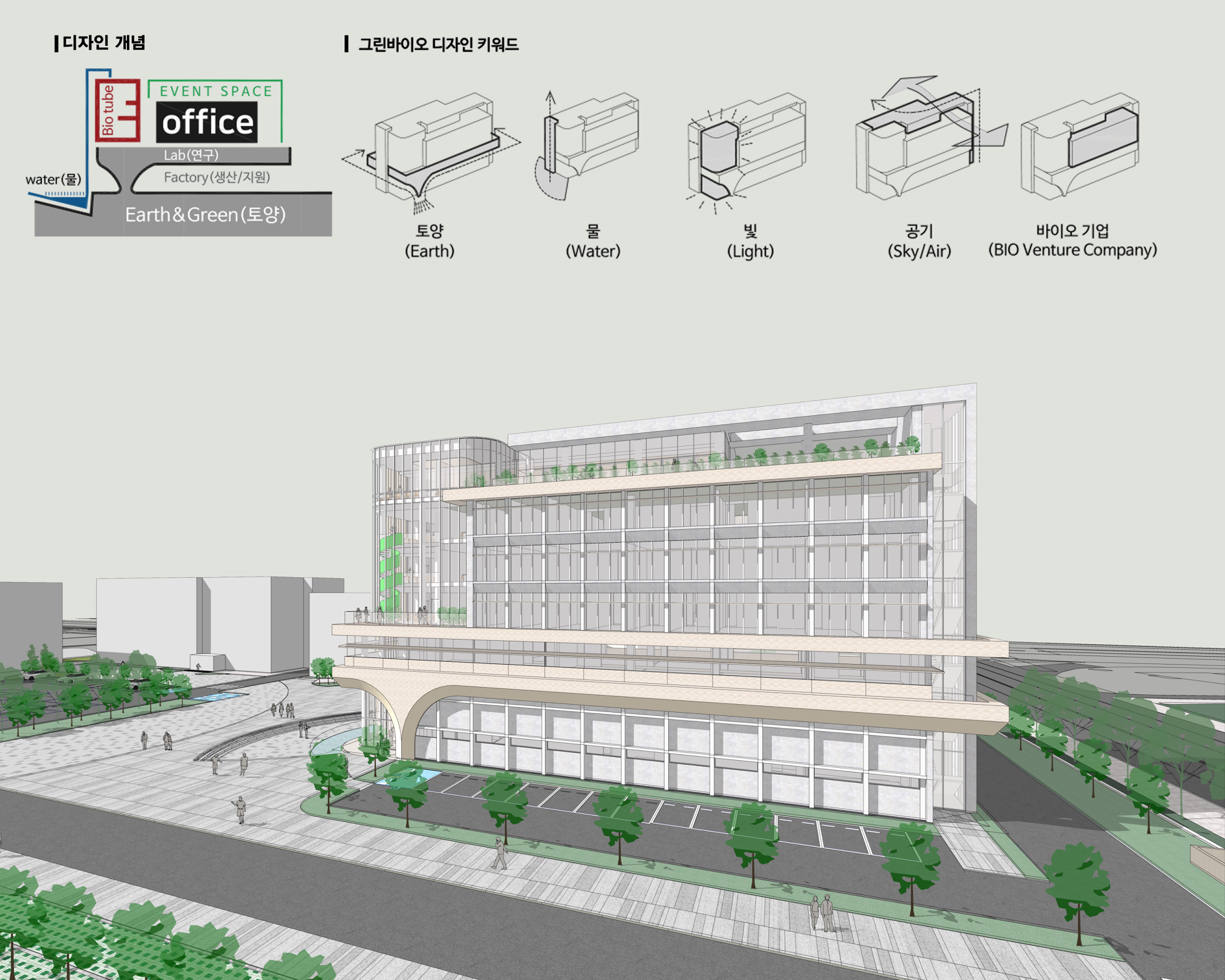 지구의 표면을 덮고 있는 “토양과 물”은 생물이 성장할 수 있는 근원이며, 지구의 표면 위로 “공기와 빛”은 에너지를 순환하는 필수적인 요소이다. 지속가능성을 외치며 친환경, AI, 로봇, 식량위기 등이 거론되는 미래의 사회에 그 어떤 것보다 중요한 자연의 근원적 요소를 디자인 모티브(motive)로 하였다. 그린바이오 기업에 특화된 산업생태계 구축을 위해 캠퍼스 중심에서 상징적인 요소가 적용된 건물디자인으로 그린바이오 캠퍼스 분위기를 조성하였다.