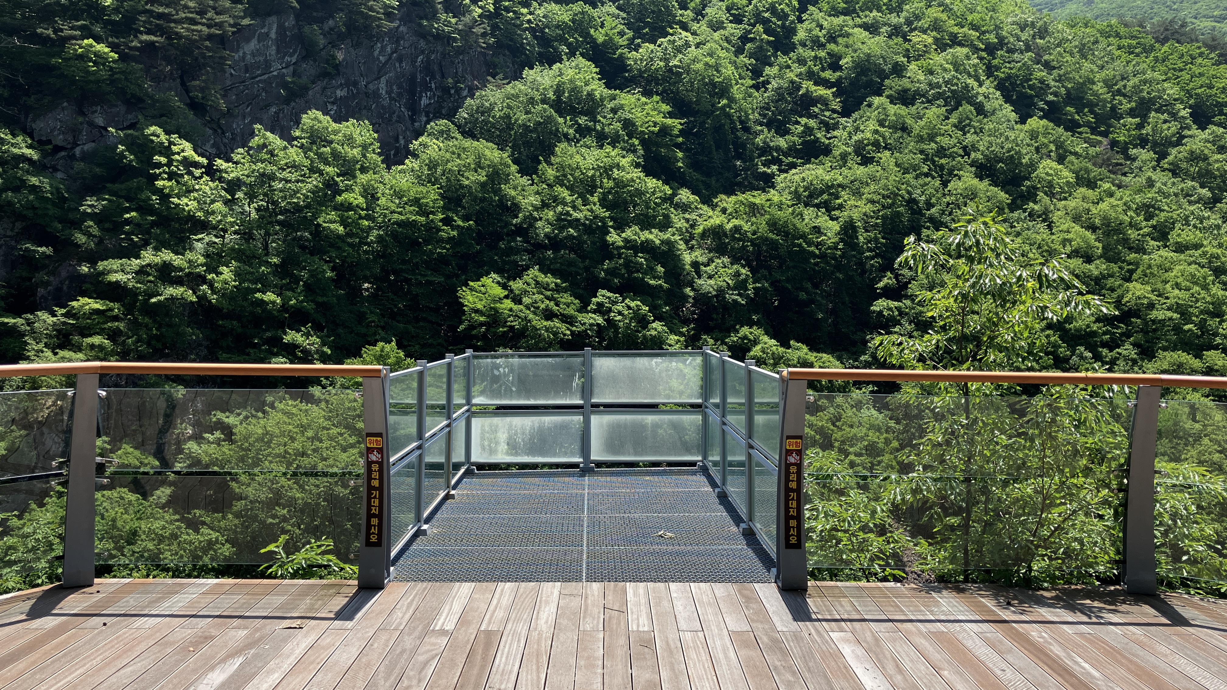대략 해발고도 650M 정도 되는 높이에 있는 층층폭포는 높은 낙수에 의한 공간의 감흥을 바로 앞에서 느낄 수 있다. 높은 낙수에 의한 시원한 냄새, 촉촉한 습기, 굉음과도 같은 물소리와 높은 곳에서 떨어지는 물이 분산되고 바위를 만나 물길을 만든다. 흐르는 계곡물을 보고 있자니 시간이 멈춘것 같다. 아무 생각이 없어졌는데 깊은 생각에 빠진 것 같은 묘한 감정이 돈다.