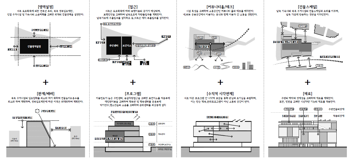 사업부지는 주거지역(다세대,다가구,기숙사 등)으로 둘러쌓여 일조침해, 전면가로경관, 프라이버시, 소음 등 고려해야할 사항이 많으며, 행정시설과 보건지소가 복합된 시설이며 그 외 80%는 체육관+실내테니스장+풋살코트+휘트니스센터+골프연습장+GX/요가 등 체육시설의 프로그램으로 공공성과 사용성에 촛점을 두고 시작하였다.