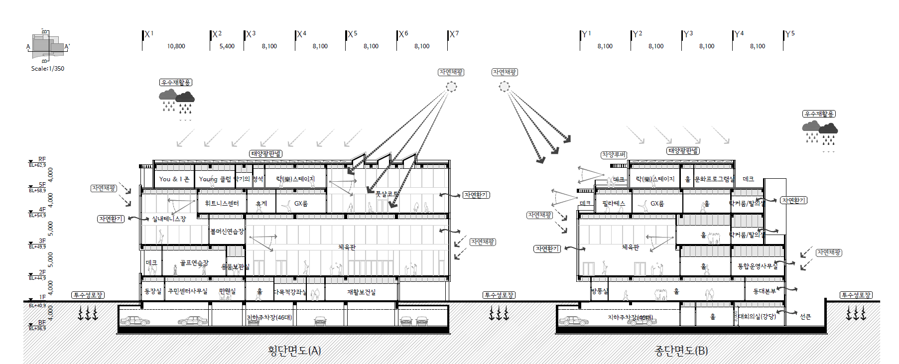 단면계획: 운동시설은 실내공간속에 각자의 용도에 맞게 사용하는 것으로 끝나지 않고, 운동시설 간 시설적 교류가 가능한 배치를 통해 개인의 경험이 확산되어 공공성이 확산되고 커뮤니티의 촉진을 고려한 계획.