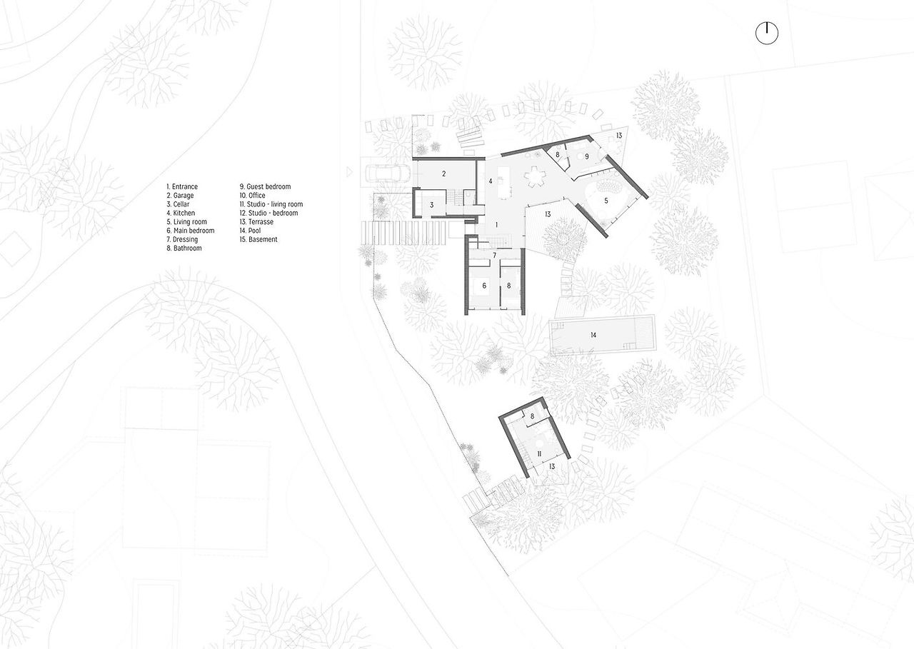 건물이 땅에 앉혀지기 위한 최소한의 개입이 이루어졌다. 주변의 자연환경을 최대한 보존하고자 하는 노력이 아래의 평면과 배치, 형태에서 명확히 드러난다.