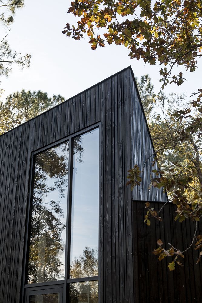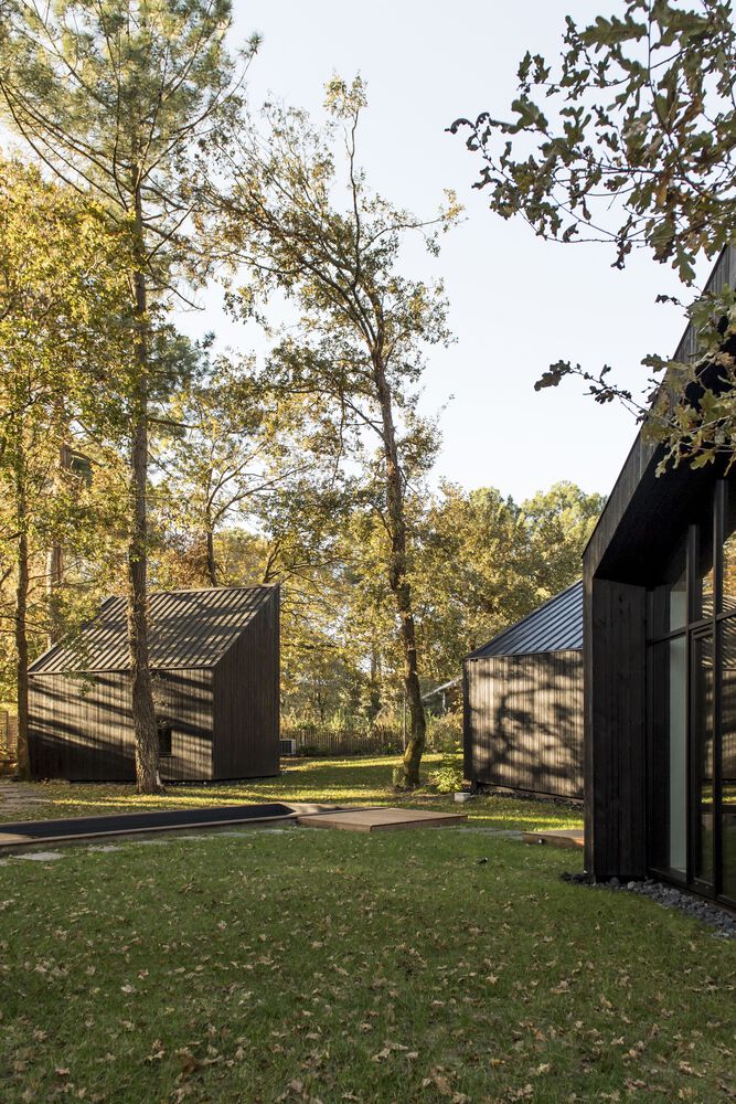 배치전략과 목재 외장재의 사용으로 나무와 숲 속에 자연스럽게 녹아들도록 하고 내부에서는 넓은 유리로 자연을 쉽게 관망할 수 있어 심리적 안정감을 준다.