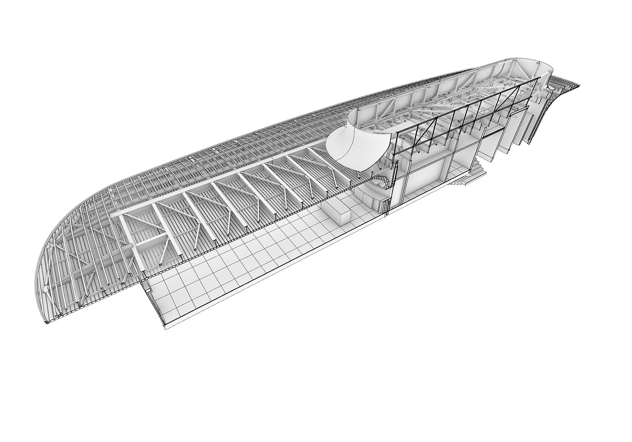 콘크리트 구조물과 글루램 목재구조의 외장, 지붕의 금속 프로파일로로 구성된 하이브리드 건설방식이다.