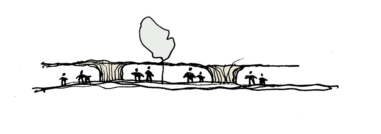 3개 영역으로 나눠진 파빌리온은 지역에서 더욱 친밀하고 조직적인 공간적 역할을 하기 위해 보행이 번잡한 곳과 차량이 많은 쪽 각각에 배치하고 있다. 보행공간쪽에는 나무 캐노피가 버스를 기다리기 위한 공간을 제공하고, 시장쪽으로는 잠깐 쉬어가는 테라스의 공간을 제공한다.