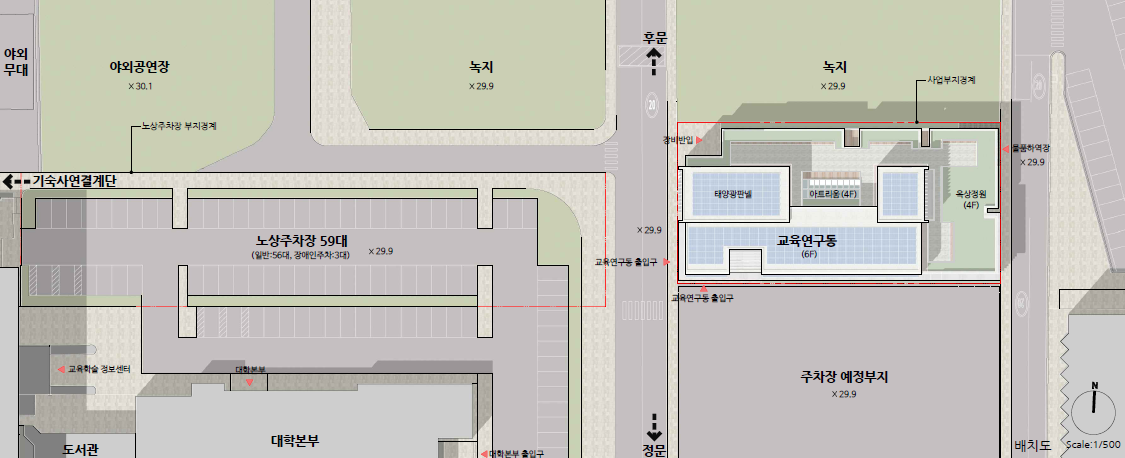 1. 캠퍼스 축과 이어지는 "주출입구-내부 러닝센터 연계계획"