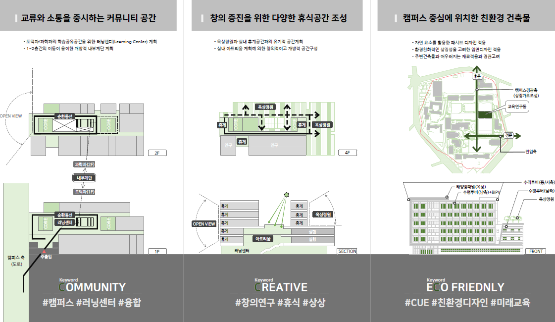 3. 정문 진입시 본부건물과 함께 가장 먼저 인지되는 건축물로써 중장기적 친환경 캠퍼스 구축 더불어 친환경적인 패시브 디자인 제안