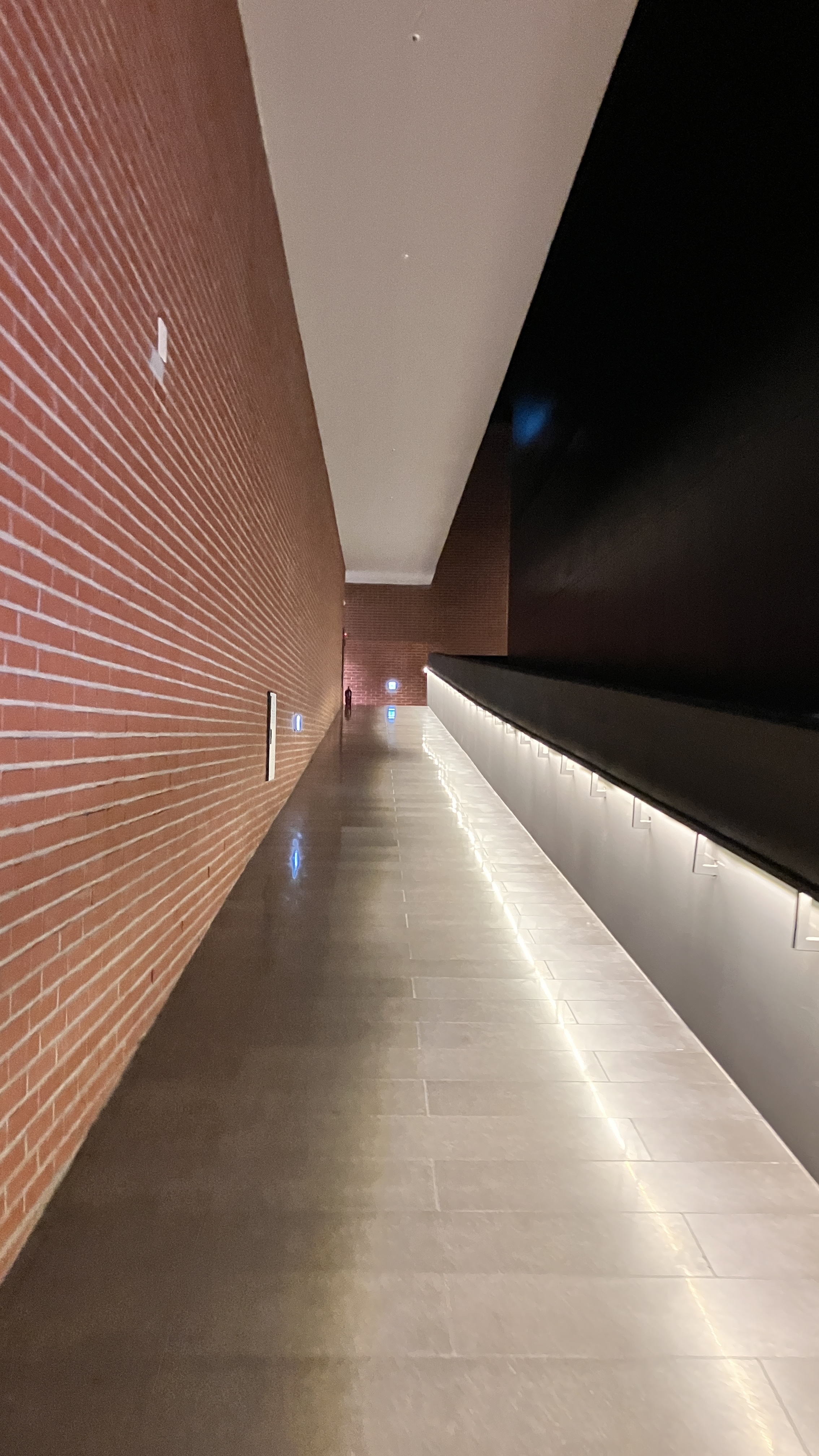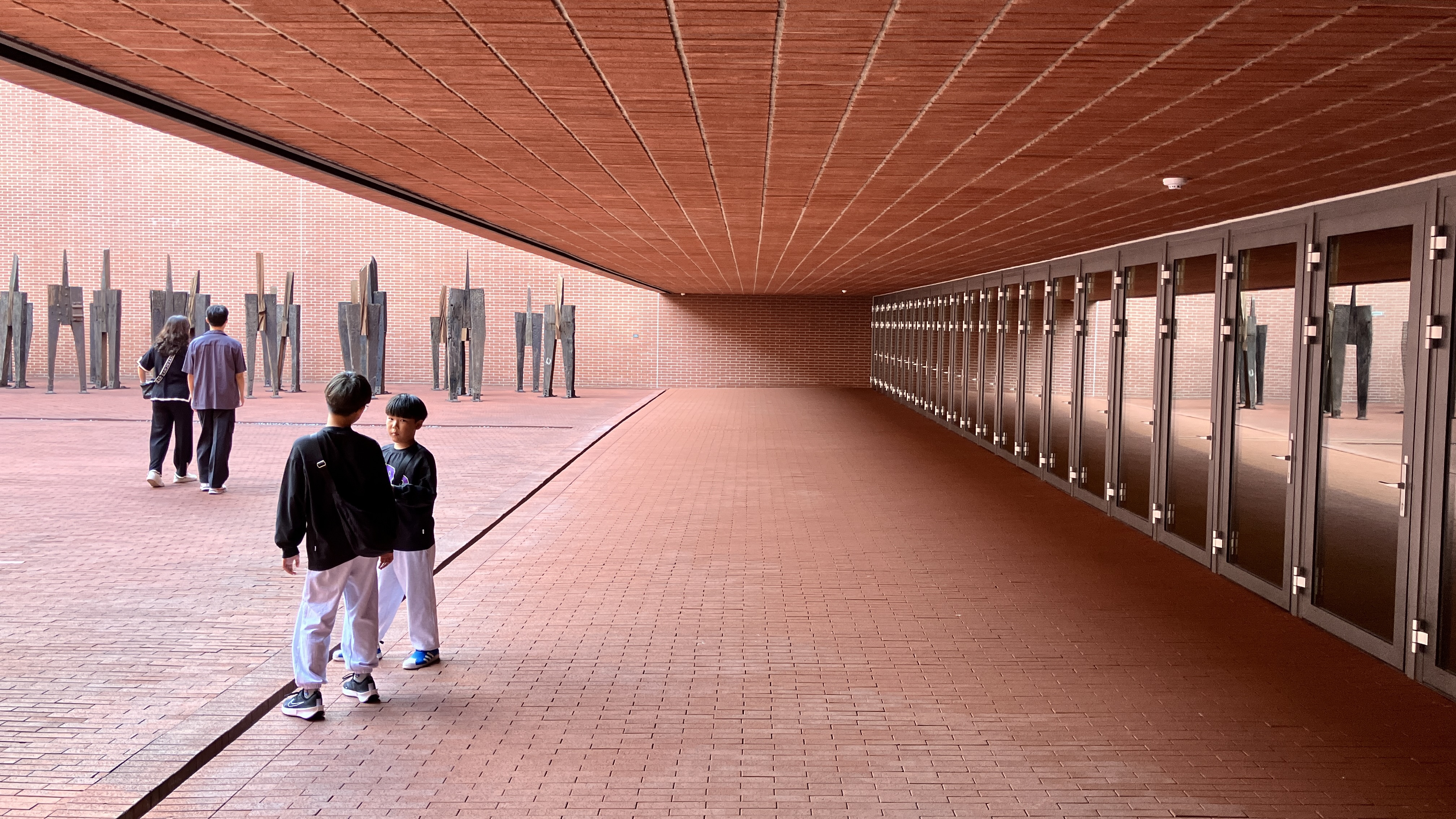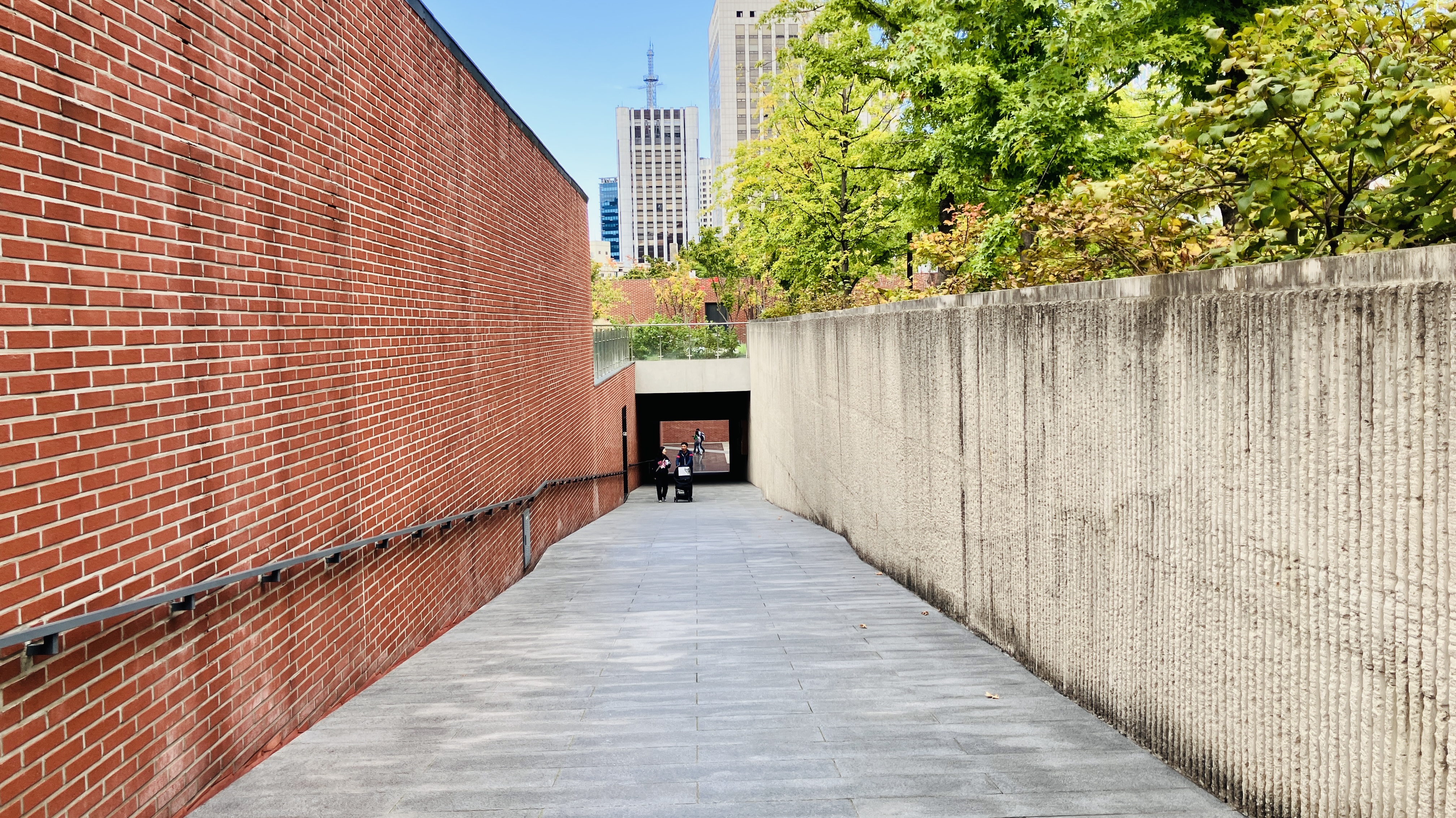 건물의 존재를 최대한 낮추고, 공원을 산책 하다보면 자연스럽게 방문하게 되는 곳이다. 외부에 접한 도로에서 건물의 로비로 진입하고 전시를 관람하는 일련의 과정에서 경계를 지우고 있는 느낌을 받았다. 그리고 그 경계는 계단과 같은 물리적 경계를 경사로로 처리하고, 외부에 사용된 재료를 내부의 주재료로 사용함으로 인해, 내외부의 경계를 지워 자연스럽고, 머물지 않는 연속성을 주고 있다.