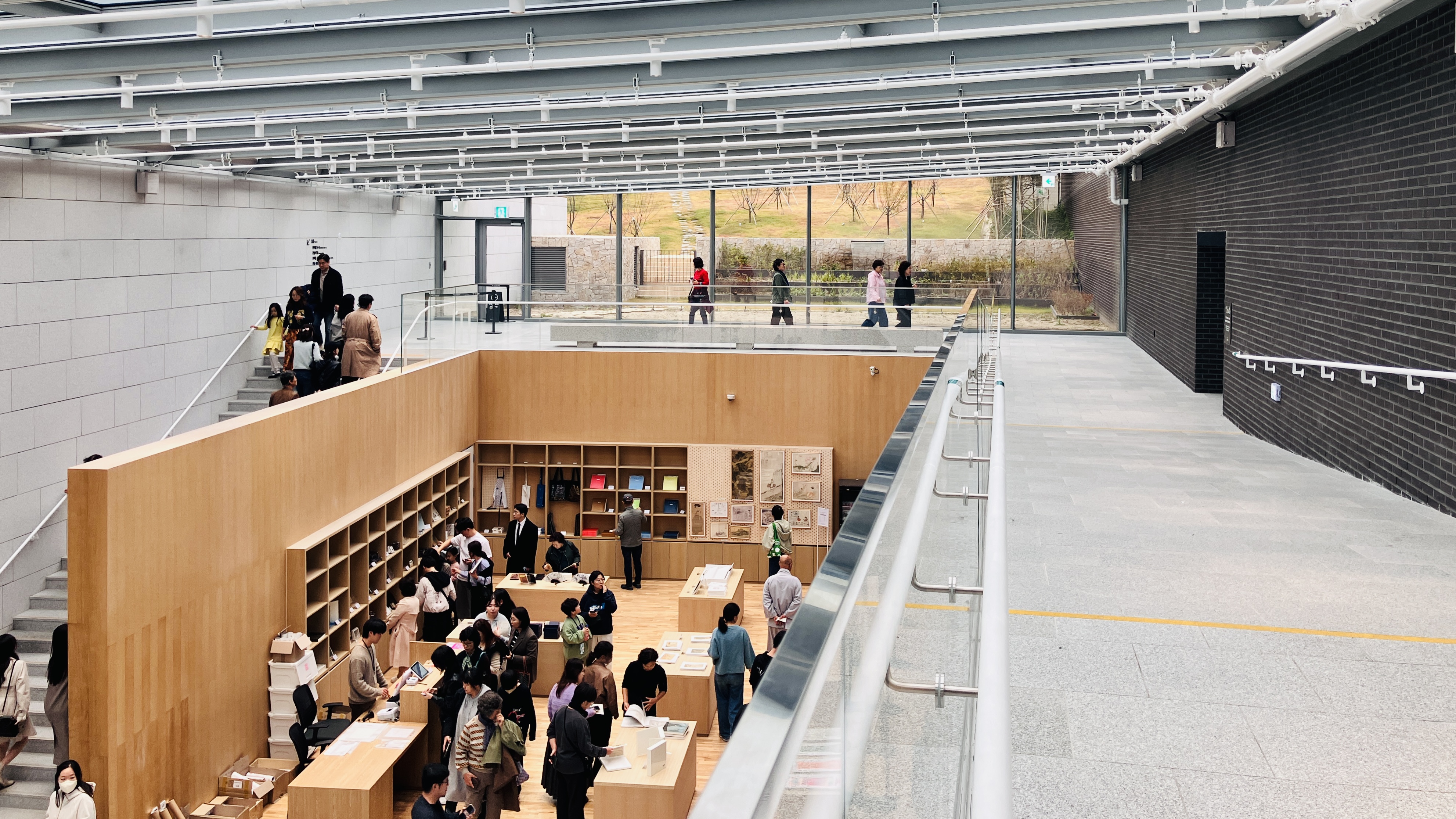 로비(지상2층)에서 계단과 경사로로 지상1층으로 이어지도록 되어 지상1층 중앙홀과 아트숍이 하나의 대공간으로 구성되어 있다. 이 중앙홀 공간 전체는 벽면과 천장이 전체 유리로 되어 마치 외부의 공원과 외장재료를 실내로 이어지도록 하기 위한 있는 것을 의도 한 것 같다. 한옥이 가진 내외부 공간을 잇는 건축공간적 장치를 사용한 것 같다. 한여름 뜨거운 빛을 차단하기 위한 전동식 블라인드가 설치되어 있다.