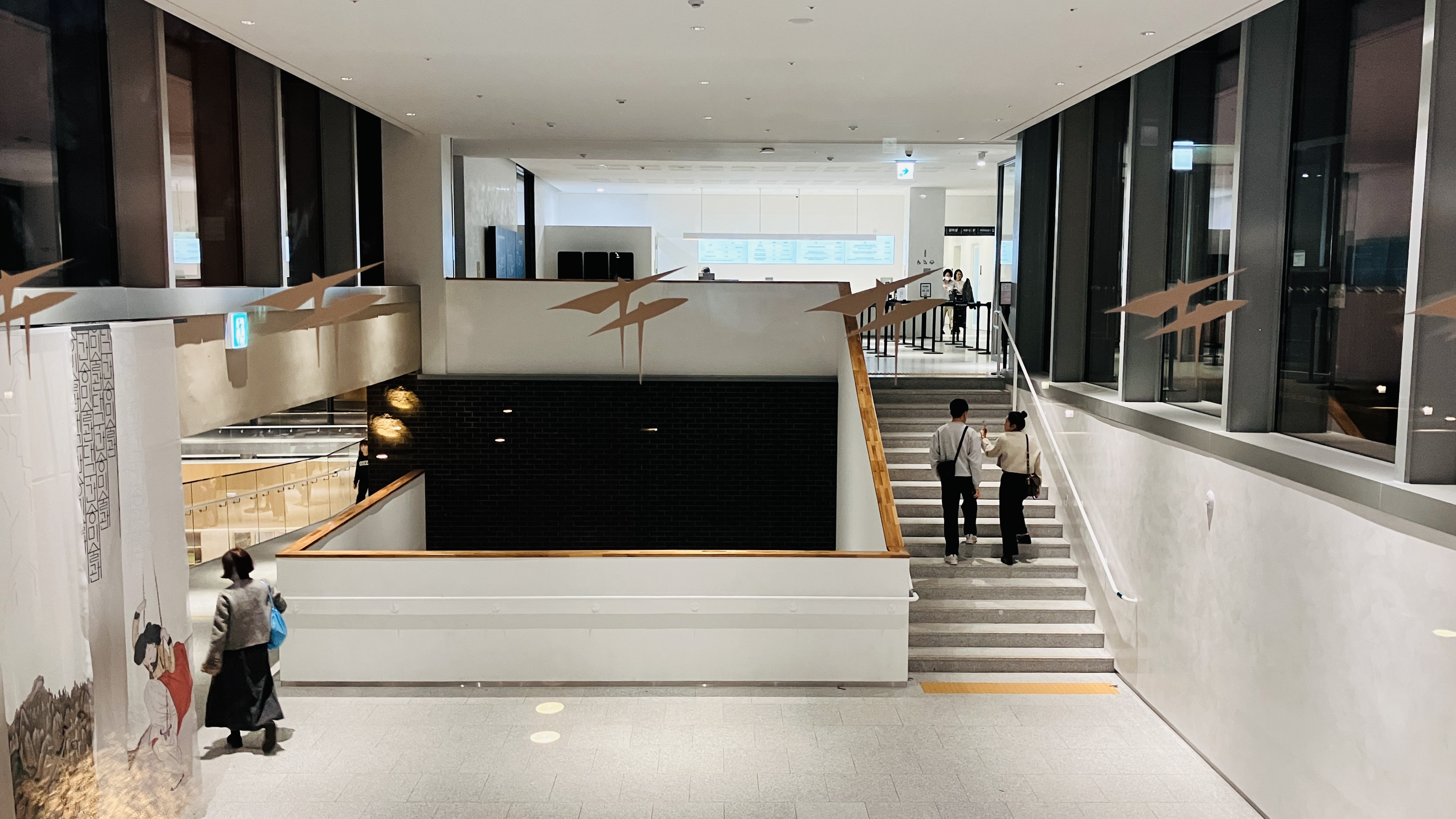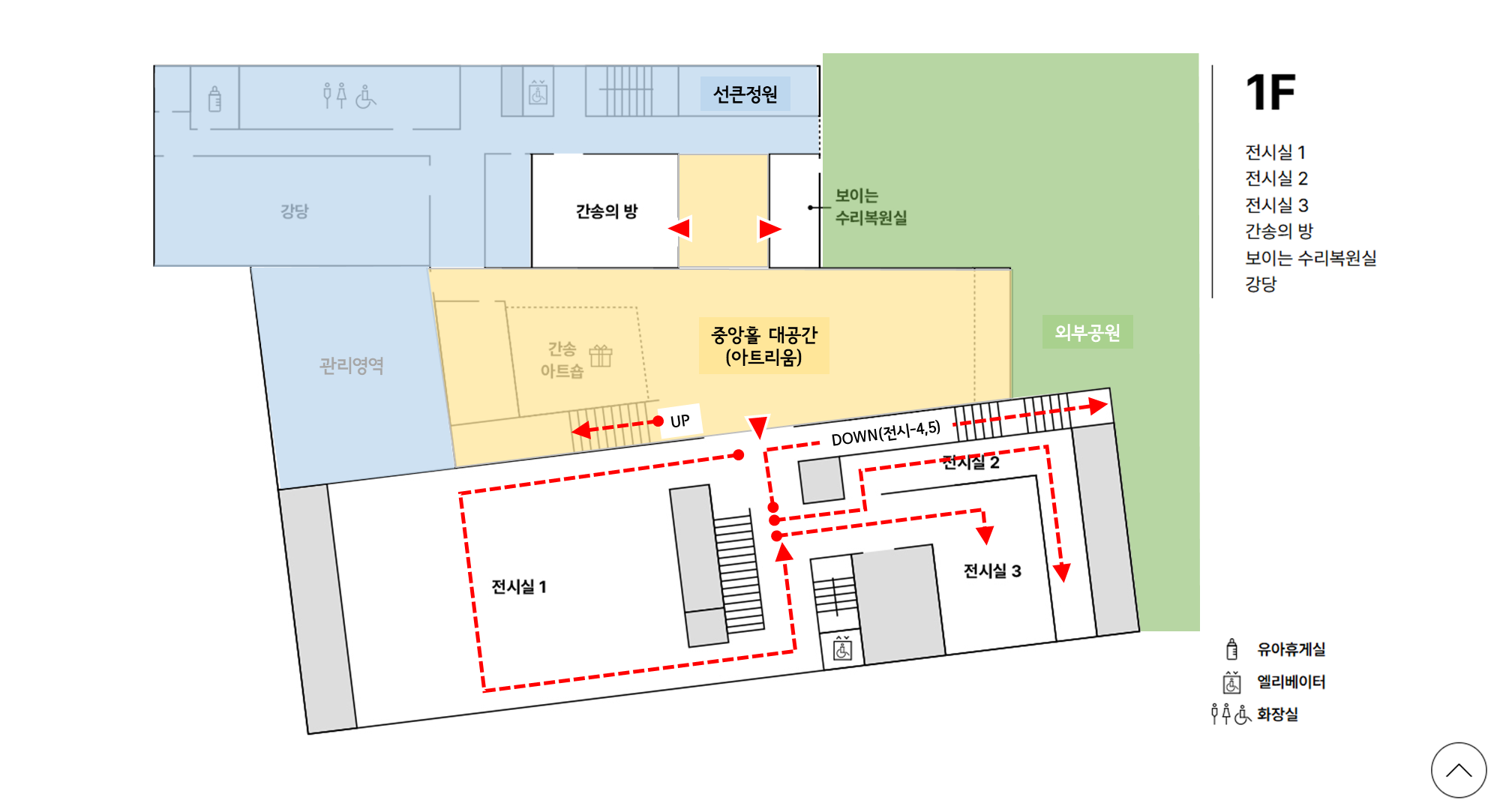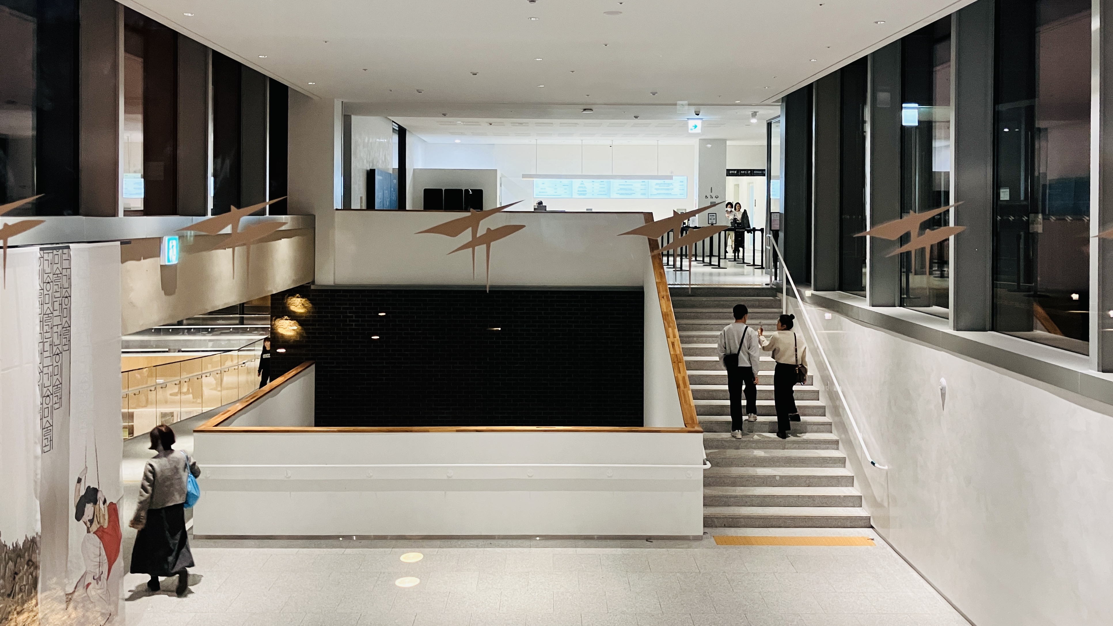 중앙홀에서 전시실-1,2,3을 관람할 수 있고 서울 보화각을 옮겨놓은 간송의 방과 맞은편은 오후2~4시 사이시간에 수리복원하는 과정을 직접 눈을 보고 질문도 할 수있는 보이는 수리복원실이 마련되어 있다. 그리고 지하1층으로 가는 계단과 경사로가 연결되어 전시실-4,5로 이어진다. 이 공간이 조금은 아쉬운 점이다.