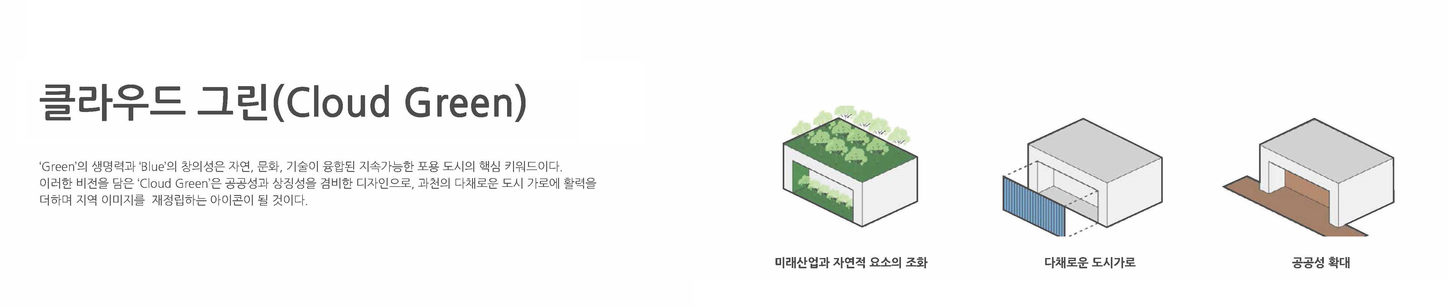 5. 지자체 BI와 색을 고려한 정면디자인: 그린(green)의 생명력과 블루(blue)의 창의성을 담은 색상계획으로 다채로운 도시가로에 활력을 더하여 지역이미지 재정립