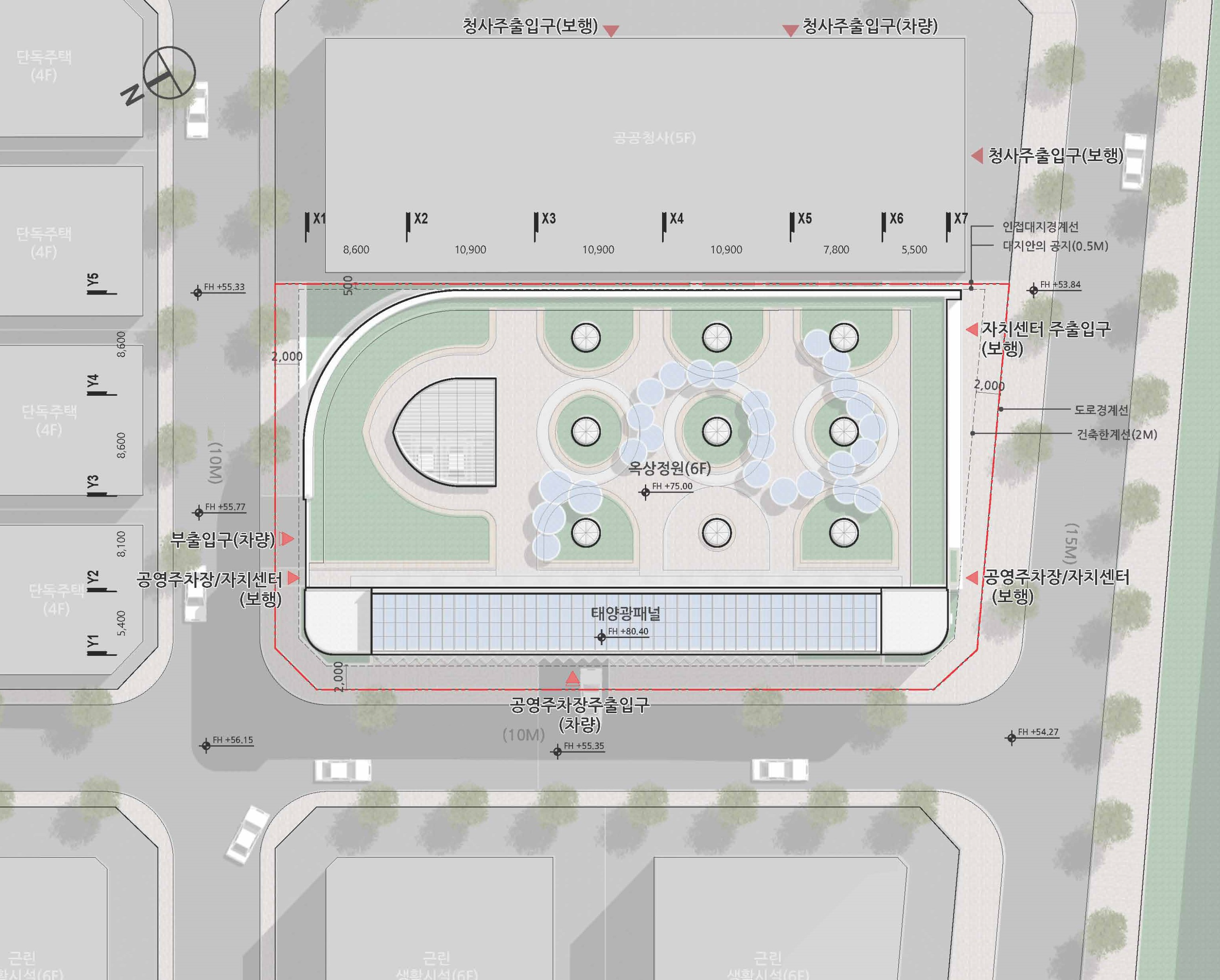 2. 옥상정원과의 연계와 저층부 공공성 확대를 위해 커뮤니티 마당설정과 정면 녹지공간 조성으로 옥상정원의 인지성 강화