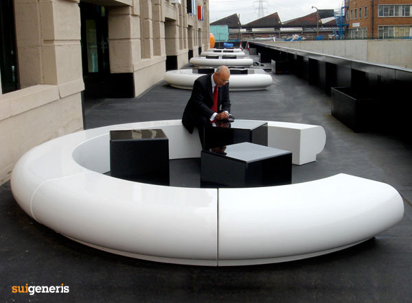 - ABS, GRP(유리섬유강화플라스틱) 등은 내충격성, 가공성, 비용 효율 측면에서 장점을 지니며, 공공시설이나 유아용 가구에서 자주 사용된다. 대개 반투명한 유색으로 착색이 쉽고 충격과 열에 강하다. GRP는 강도가 뛰어난 유리섬유를 합성한 복합재료로 철에 비유할 만큼 강도가 높으면서 종이처럼 가볍다. 비용이 저렴하고 가공도 쉬워 폭넓게 사용된다.