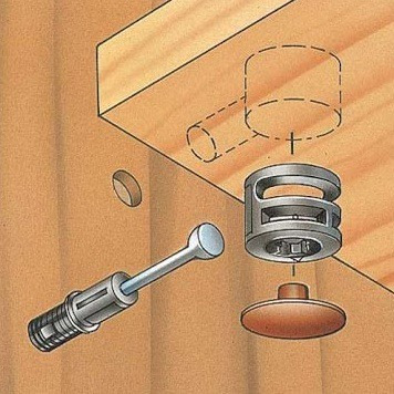 - 미니픽스는 옆판과 바닥판, 옆판과 천장판 등 직각으로 연결할 때 쓰는 철물이다. 볼트가 보이지 않도록 가려준다.