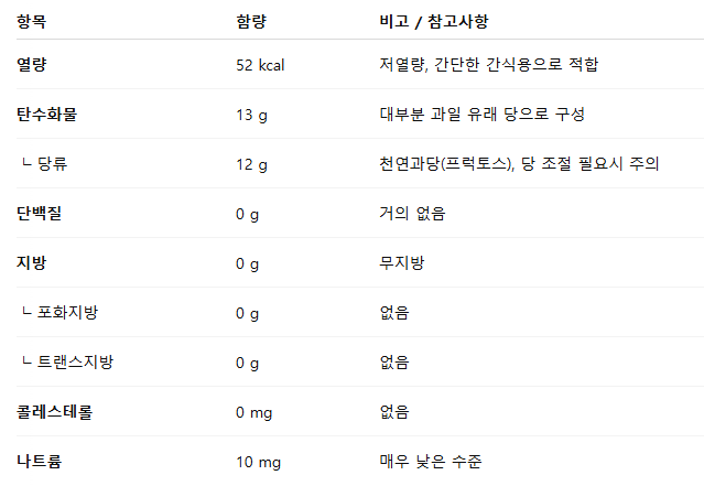 다만, 단백질과 식이섬유는 거의 없으며, 총 당류는 200ml 기준 12g으로, 대부분이 과일 유래 당(프럭토스)이다. 혈당 조절이 필요한 사람이나 다이어트를 하는 경우에는 공복에 과량 섭취하지 않도록 주의가 필요하다.