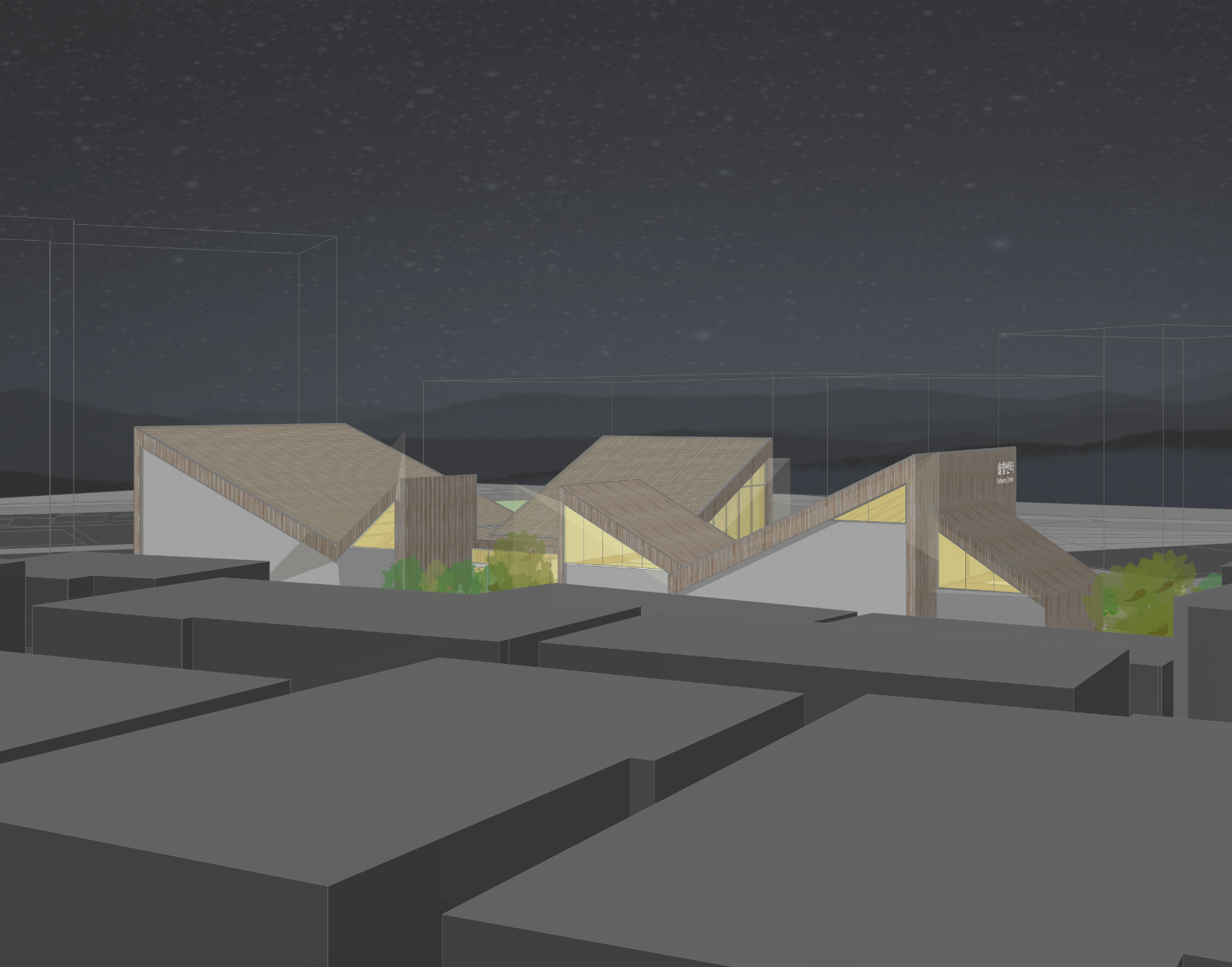 세 개의 큰 박공과 세 개의 작은 박공은 서로 다른 리듬으로 서 있으면서도 하나의 운율을 이루고, 그 아래에는 주민들이 모이고, 축제가 머물며, 일상이 스며듭니다.해가 지면 삼각 지붕 사이로 새어나오는 빛은 이 작은 건축이 전하는 따뜻한 인사 를 대신하며, 목재가 들려주는 시간의 흔적은 마을의 풍경에 천천히 스며듭니다.