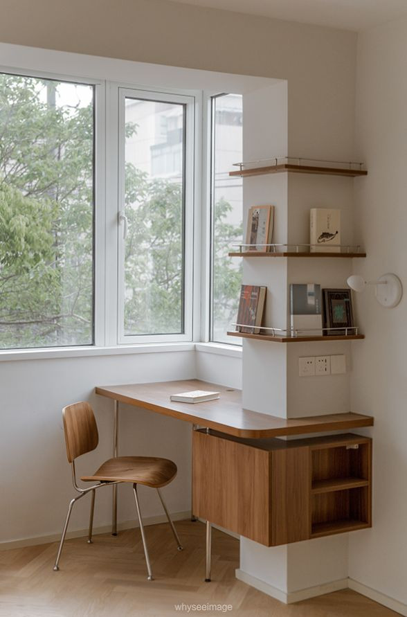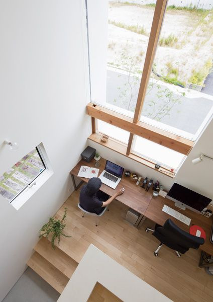 : 계단의 하부공간이나 복도공간, 창가나 사각지대를 활용하여 작업공간을 마련할 수 있다. 최대한 유틸리티를 활용하여 공간의 구분을 위해 가변형벽체(창), 접이식 데스크, 벽부착형 선반, 슬라이딩 도어을 두어 상황에 대응 할 수 있다. 사용하지 않을 때는 숨겨 둘 수도 있다.