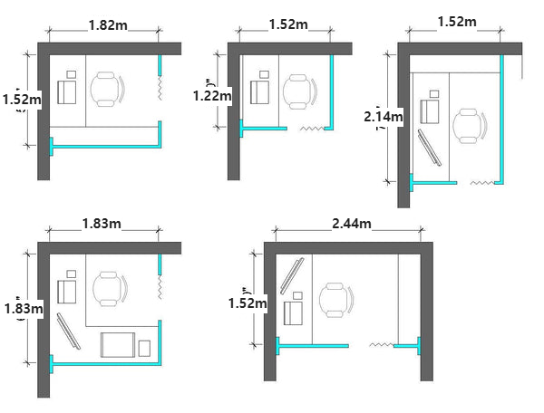 : 2.7 m² 일반적인 크기의 책상과 의자 그리고 충분한 수납공간으로 구성이 가능하며 3.8 m²는 회의에 필요한 의자 몇개와 소파, 프린터와 같은 추가장비를 놓기에 충분하며 그리기나 페인팅과 같은 활동도 가능한 크기이다. 완벽한 프라이버시와 몰입도, 화상회의, 자료정리, 창작활동 등 다양한 업무에 대응이 가능하다.