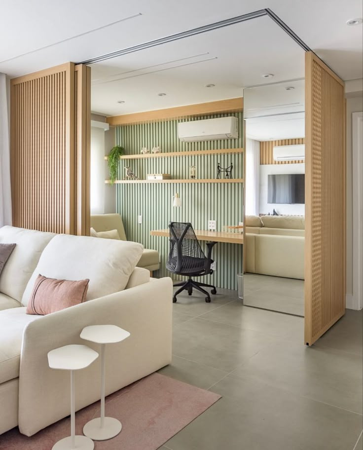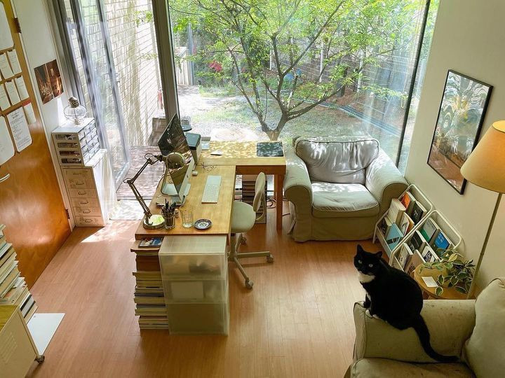 : 전용방이 없다면 거실이나 침실의 일부를 사용하는 방법도 있으나 임대료가 비싼지역에 오피스 공간을 많이 내어주는 것은 합리적이지 않을 것 같다. 공간을 구분하는 파티션이나 완전히 구분된 작업부스 등으로 구성할 수 있다. 공간 분리를 통한 심리적 집중효과 및 가족생활과의 충동을 최소화가 가능하다.