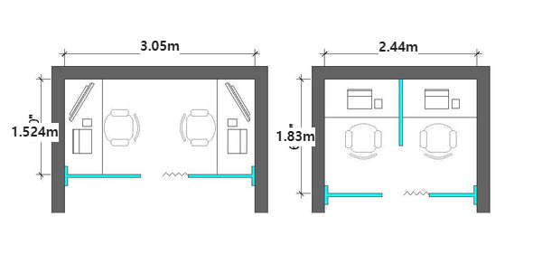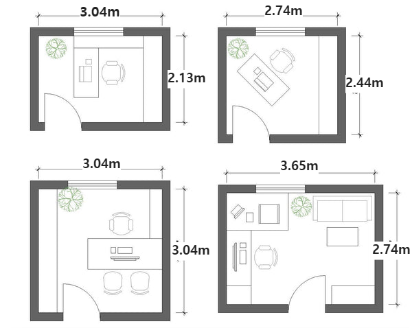 : 2.7 m² 일반적인 크기의 책상과 의자 그리고 충분한 수납공간으로 구성이 가능하며 3.8 m²는 회의에 필요한 의자 몇개와 소파, 프린터와 같은 추가장비를 놓기에 충분하며 그리기나 페인팅과 같은 활동도 가능한 크기이다. 완벽한 프라이버시와 몰입도, 화상회의, 자료정리, 창작활동 등 다양한 업무에 대응이 가능하다.