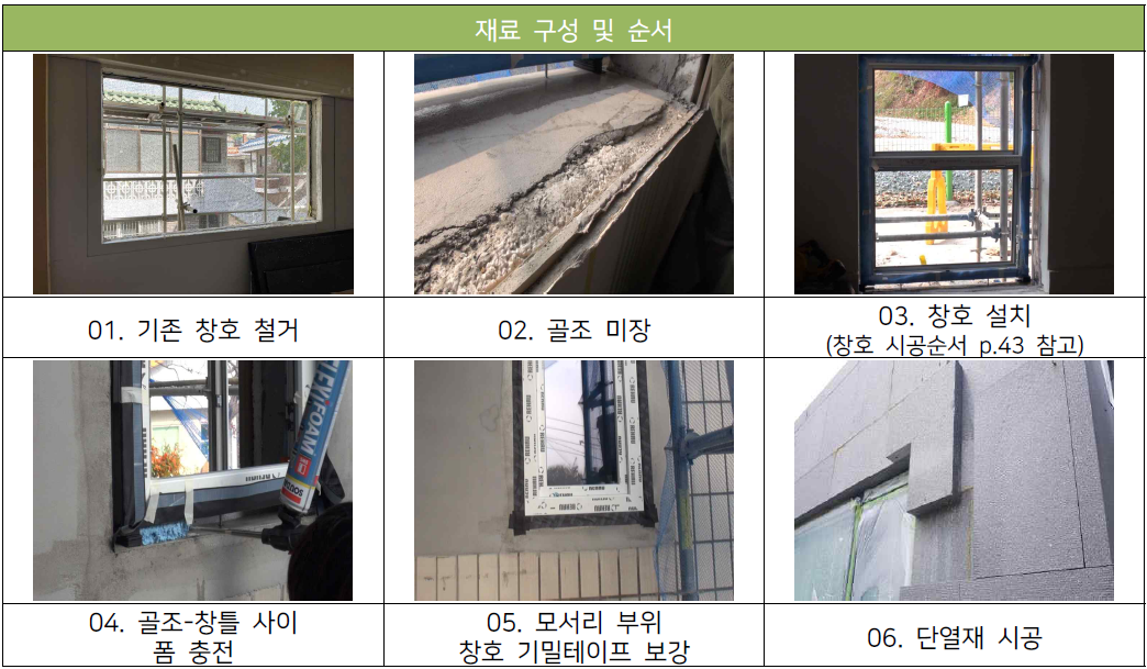 일반적인 소규모 현장에서는 공사기간, 공사비용 등의 이유로 창호철거 후 재설치의 순서를 '단열+마감->창호'의 순서로 진행하고 있으나 이와 같은 경우는 창호의 방수 또는 기밀처리가 구조체와 연결될 수 없어 많은 하자를 발생하고 있다.