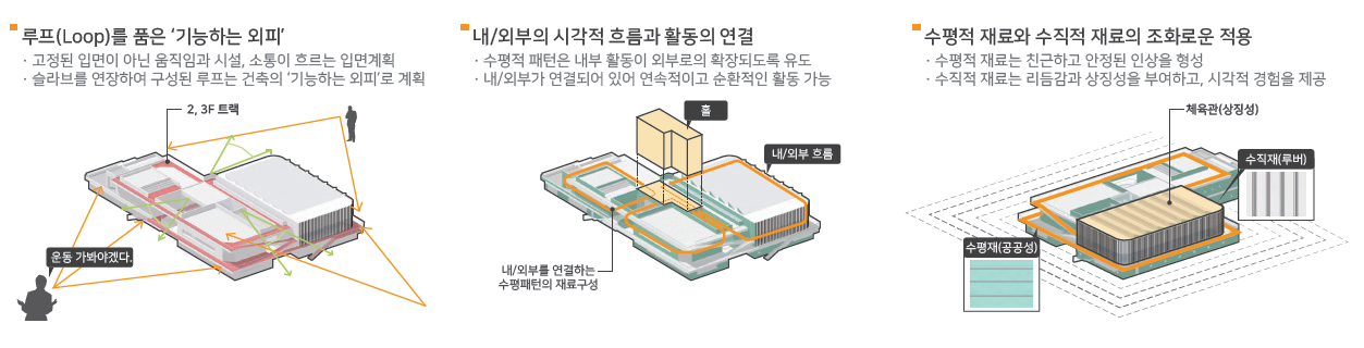 사용자의 이동을 유도하며 실내 공간과 자연스럽게 연결되면서 프로그램간의 경계를 허물고, 공간 간의 상호작용을 촉진한다. 또한, 루프(LOOP)는 시각적 투명성과 공간의 흐름을 매개로 하여 내/외부를 넘나드는 사용자 간의 관계를 이어주는 촉매 역할을 수행한다. 상징적 형태의 운동시설이 지역에 우뚝솟은 방식과 다른 방식으로의 접근으로 일상적 참여와 공동체적인 상호작용이 자연스럽게 이어지는 열린 커뮤니티 공간으로 기능한다.