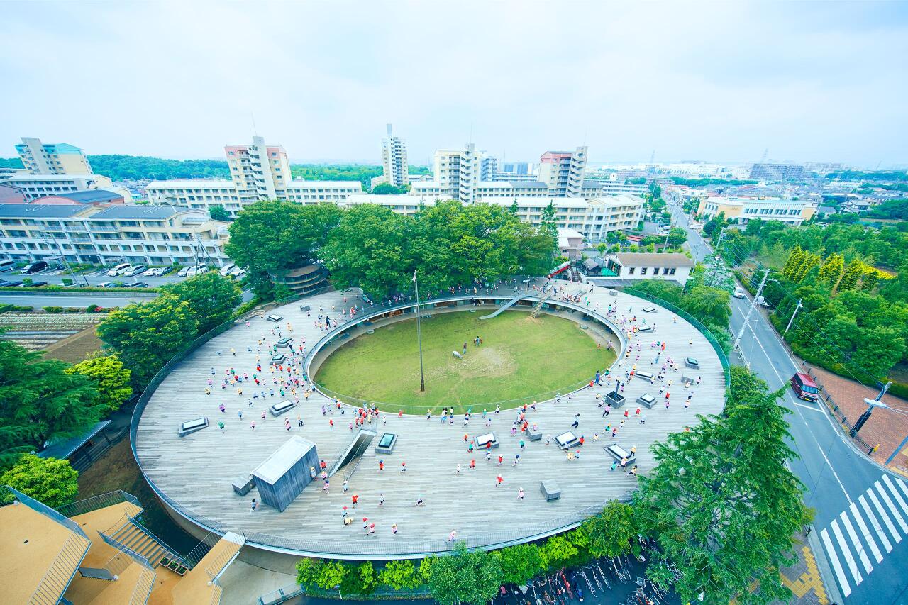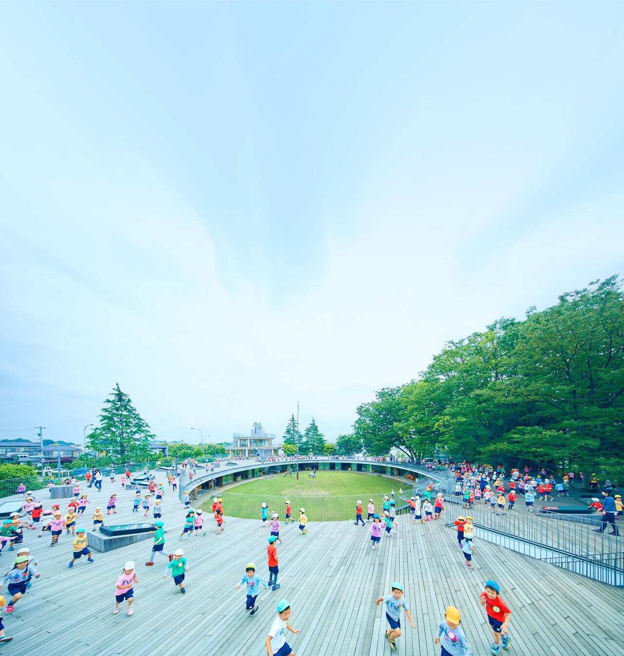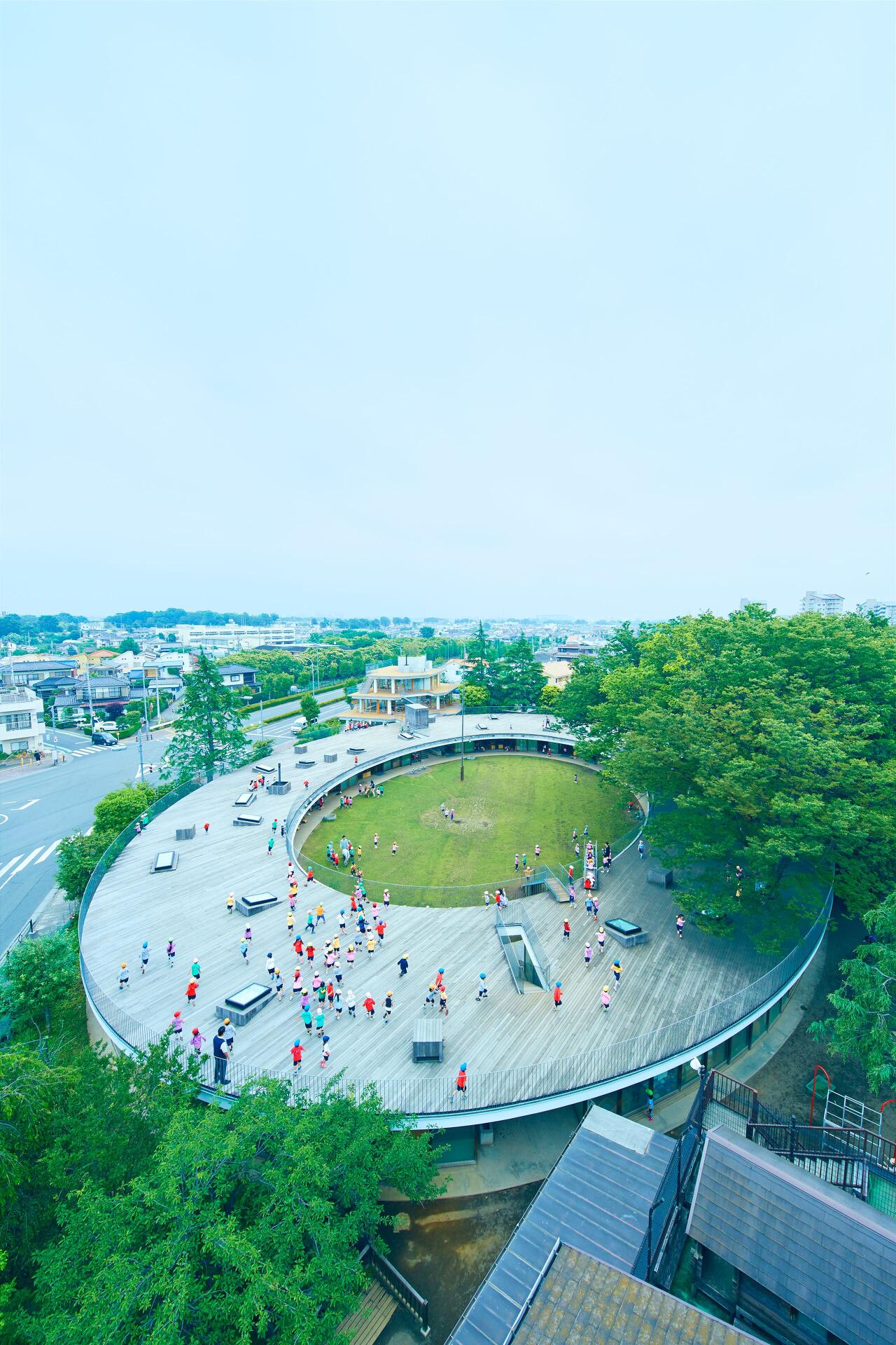 후지유치원은 아이들이 자동차 걱정 없이 한없이 뛰어놀 수 있게 타원(원)의 형태이다. 신나게 뛰어놀다가. 말 그대로 숨이 차서 쉴 때까지 뛸 수 있다. 빙글 뱅글! 그리고 타원의 중심에는 큰 정원이 있어 원내에서 아이들을 보호하고 있다. 타원의 형태는 어디서든 다 개방되어 있어, 서로를 관찰하고, 보호할 수 있다. 소외받는 아이들이 없다는 것이다. 2층에서든 1층에서든 서로가 다 보이도록 되어 있다. 아주 개방적인 구성을 보인다.